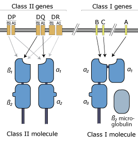 II類區(qū)域對應 HLA-DR、-DQ和 -DP基因等,編碼 α 鏈基因 (A1) 和 β 鏈基因 (B1)。α鏈和 β鏈配對形成功能性HLA分子。大多數(shù)個體攜帶額外的DRB基因 (DRB3 或 DRB4 或 DRB5),該基因編碼可能與α鏈配對的不同β鏈。