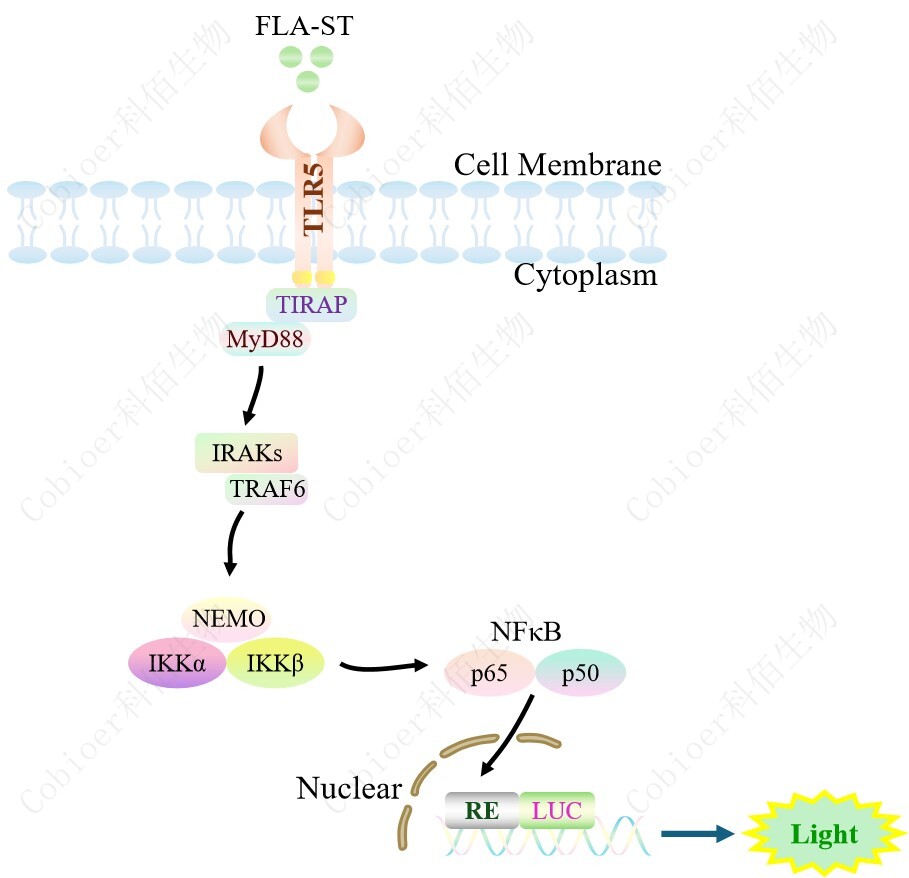 TLR5 NFκB-Luc HEK293 報告基因藥靶模型很好的模擬了體內 TLR5 的信號轉導過程, 原理見下圖所示。