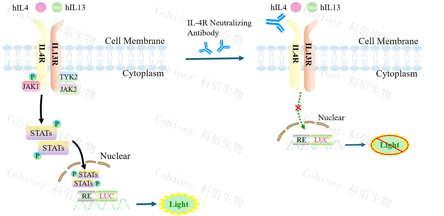 IL4/IL13 Effector Reporter Cell 報(bào)告基因藥靶模型很好的模擬了體內(nèi) IL4/IL13 的信號(hào)轉(zhuǎn) 導(dǎo)過程,原理見下圖所示。