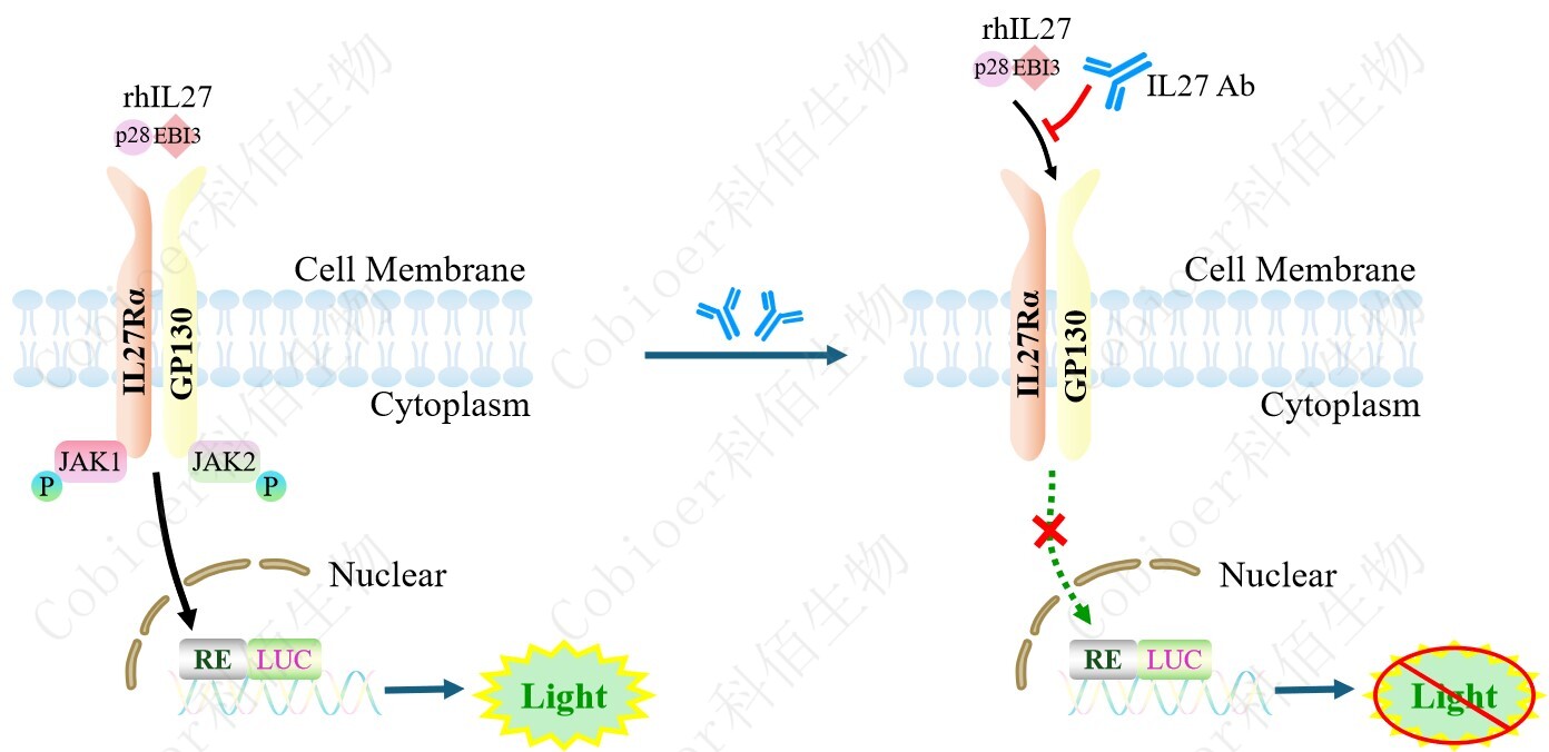 IL27 Effector Reporter Cell 報(bào)告基因藥靶模型很好的模擬了體內(nèi) IL27 的信號轉(zhuǎn)導(dǎo)過程, 原理見下圖所示。![]() Figure 1. IL27 Effector Reporter Cell 細(xì)胞模型原理圖 |
