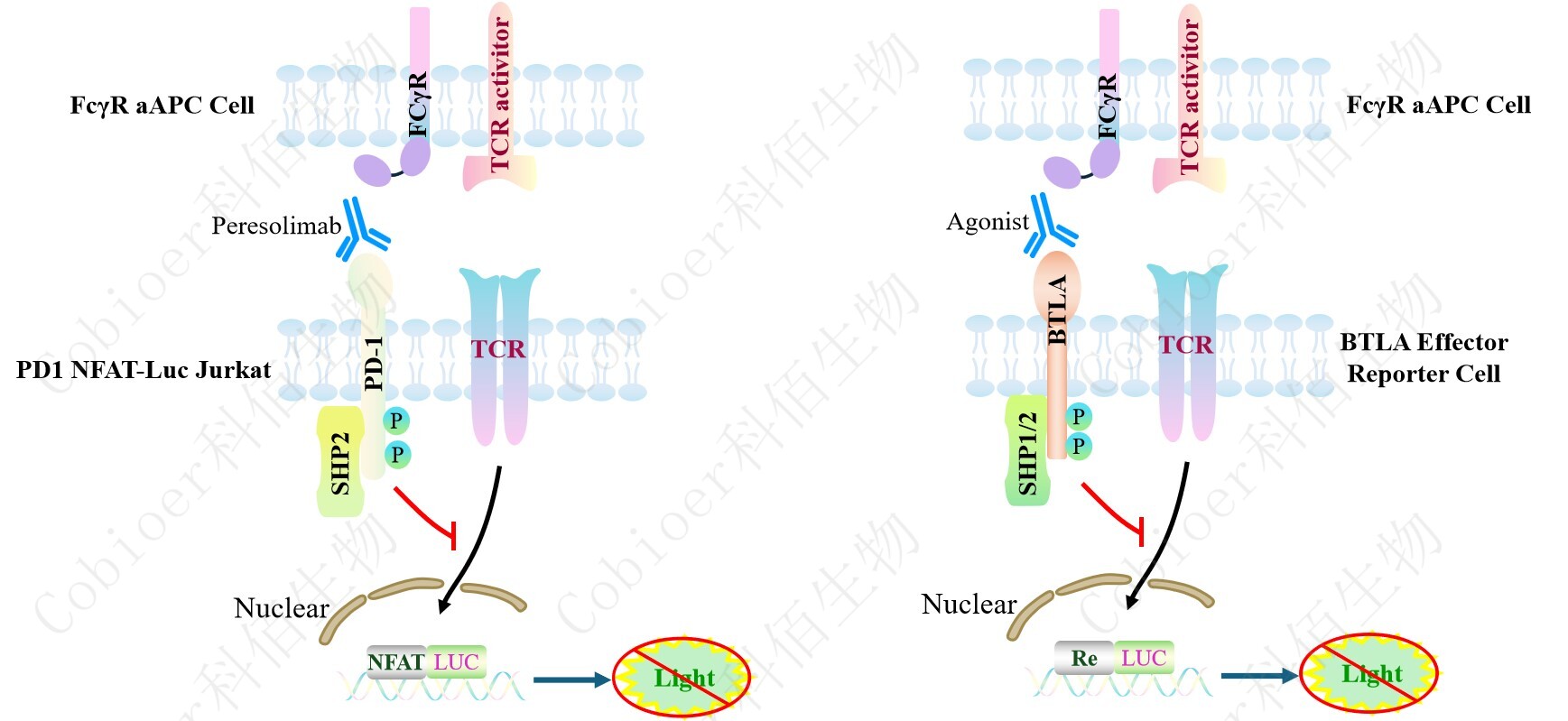 FcγR aAPC Cell在基礎(chǔ)細胞上穩(wěn)定表達 FcγR 和 aAPC。FcγR aAPC Cell 作為 PD1 NFAT-Luc Jurkat Cell/BTLA Effector Reporter Cell 的靶細胞進行功能檢測的原 理圖見下圖所示。![]() Figure 1. FcγR aAPC Cell 的原理圖 |