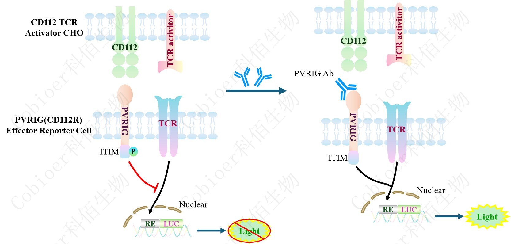 CD112 TCR Activator CHO 細胞作為 PVRIG(CD112R) Effector Reporter Cell 的靶細胞, 很好的模擬了體內(nèi) PVRIG(CD112R) 的信號轉(zhuǎn)導(dǎo)過程,原理見下圖所示。
