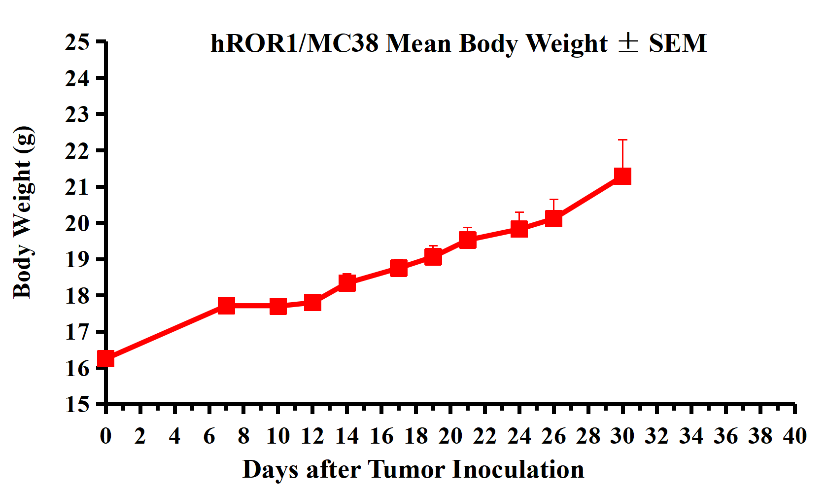 Figure 2. hROR1/MC38 Mean Body Weight ± SEM.