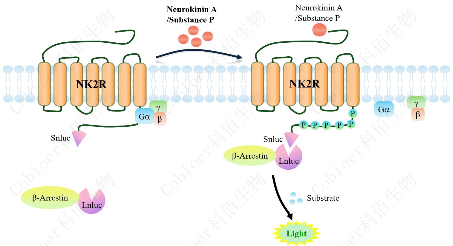 NK2R β-Arrestin CHO 報告基因藥靶模型很好的模擬了體內(nèi) NK2R/β-Arrestin 的信號轉(zhuǎn) 導(dǎo)過程,原理見下圖所示。當(dāng)缺乏配體刺激時,β-Arrestin 不與 NK2R 結(jié)合,融合β-Arrestin 的熒光素酶處于失活構(gòu)象,當(dāng) NK2R 遭遇配體刺激時,融合熒光素酶報告基因的β-Arrestin 被招募,使熒光素酶報告基因處于激活狀態(tài),加入其底物后發(fā)光信號增強(qiáng)。