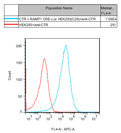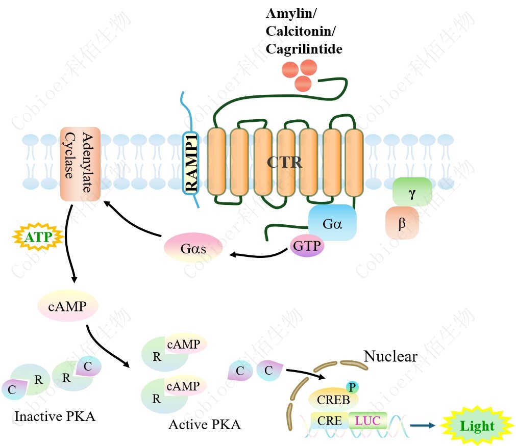 CTR&RAMP1 CRE-Luc HEK293 報(bào)告基因藥靶模型很好的模擬了體內(nèi) CTR&RAMP1 的信號(hào)轉(zhuǎn)導(dǎo)過(guò)程,原理見(jiàn)下圖所示。![]() Figure 1. CTR&RAMP1 CRE-Luc HEK293 細(xì)胞模型原理圖 |