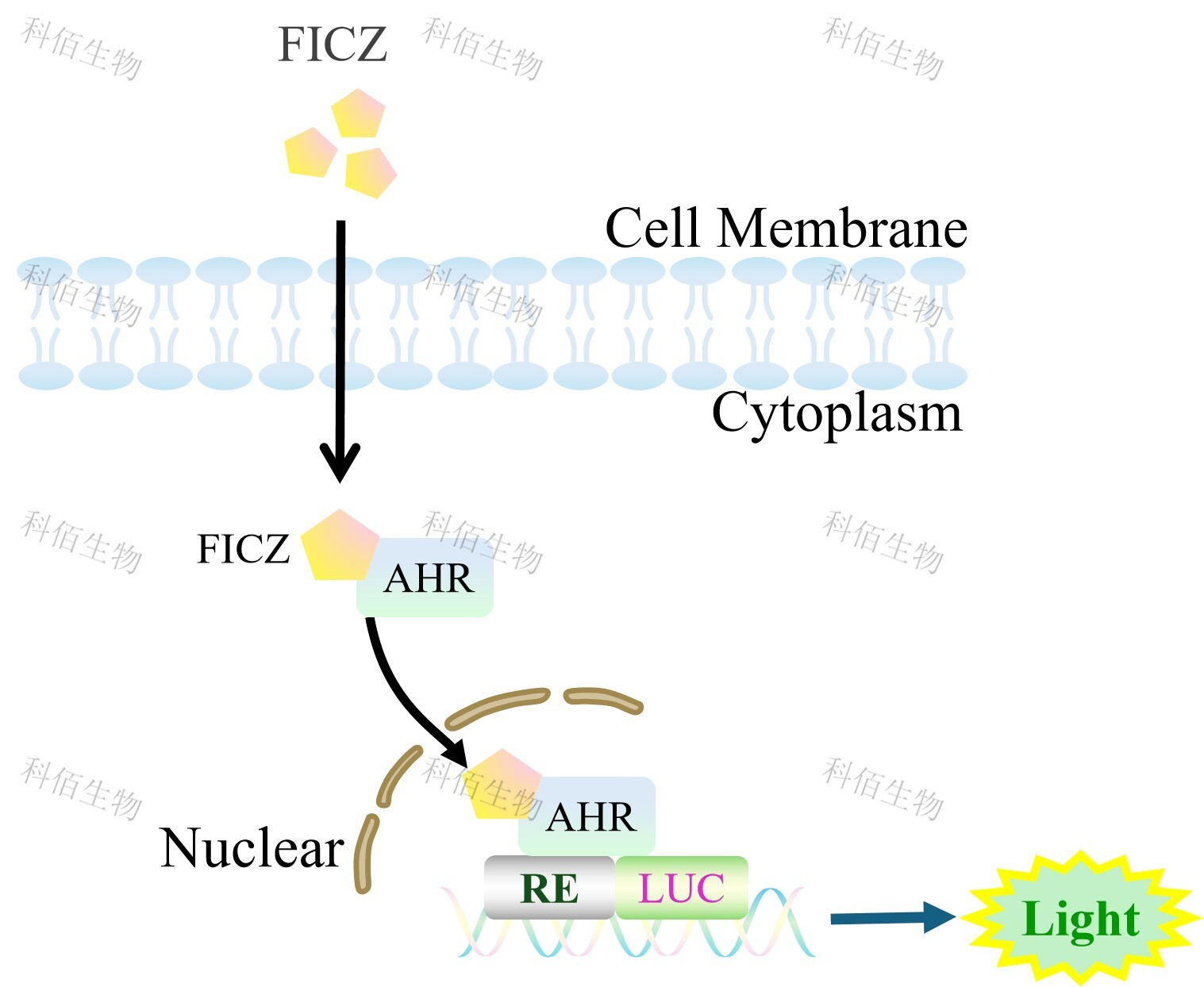 AHRE Luciferase Reporter HT29 藥靶細(xì)胞,在由調(diào)控因子調(diào)控并表達(dá)報(bào) 告基因的重組細(xì)胞上,穩(wěn)定表達(dá)人 AHRE。FICZ 是有效的芳烴受體 (AhR) 激動(dòng)劑,原理見下圖所示。 ![]() Figure 1. AHRE Luciferase Reporter HT29 細(xì)胞的構(gòu)建原理圖 |