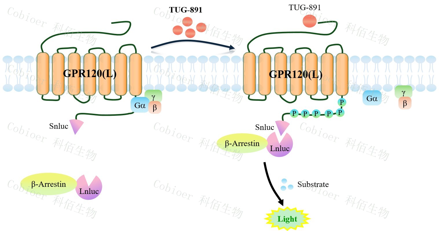 GPR120(L) β-Arrestin CHO 報(bào)告基因藥靶模型很好的模擬了體內(nèi) GPR120(L)/β-Arrestin 的信號轉(zhuǎn)導(dǎo)過程,原理見圖 1 所示。當(dāng)缺乏配體刺激時(shí),β-Arrestin 不與 GPR120(L)結(jié)合, 融合β-Arrestin 的熒光素酶處于失活構(gòu)象,當(dāng) GPR120(L)遭遇配體刺激時(shí),融合熒光素酶報(bào) 告基因的β-Arrestin 被招募,使熒光素酶報(bào)告基因處于激活狀態(tài),加入其底物后發(fā)光信號增 強(qiáng)。![]() Figure 1. GPR120(L) β-Arrestin CHO 細(xì)胞模型原理圖 |