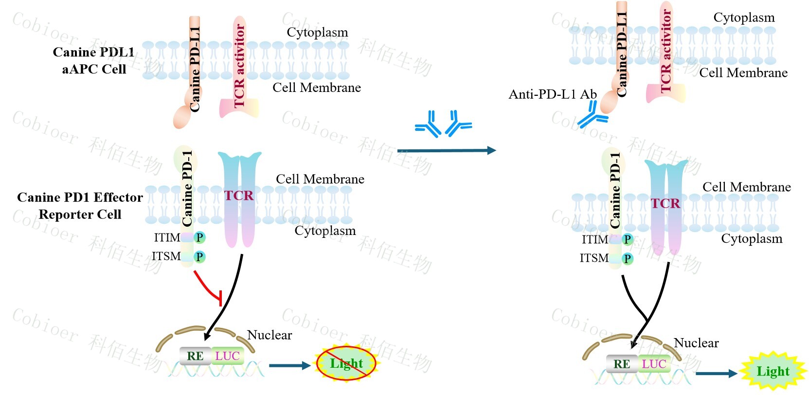 Canine PDL1 aAPC Cell 作為 Canine PD1 Effector Reporter Cell 的靶細(xì)胞,Canine PDL1 aAPC Cell 藥靶模型很好的模擬了體內(nèi) PD1&PDL1 的信號(hào)轉(zhuǎn)導(dǎo)過(guò)程,原理見(jiàn)下圖所示。![]() Figure 1. Canine PDL1 aAPC Cell 細(xì)胞模型原理圖 |