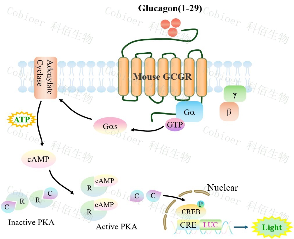 Mouse GCGR CRE-Luc HEK293 報(bào)告基因藥靶模型很好的模擬了體內(nèi) GCGR 的信號(hào)轉(zhuǎn)導(dǎo)過(guò)程,原理見(jiàn)下圖所示。