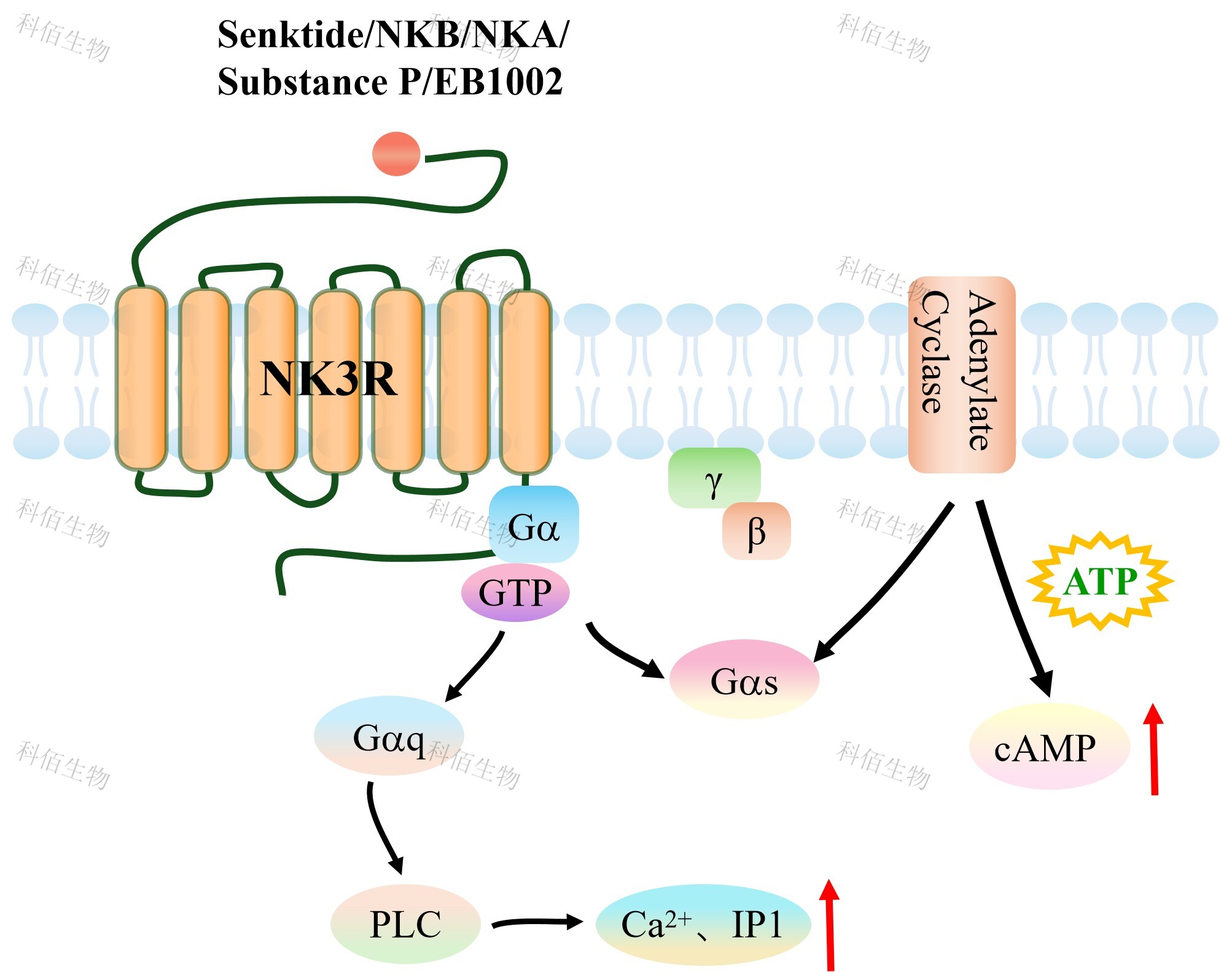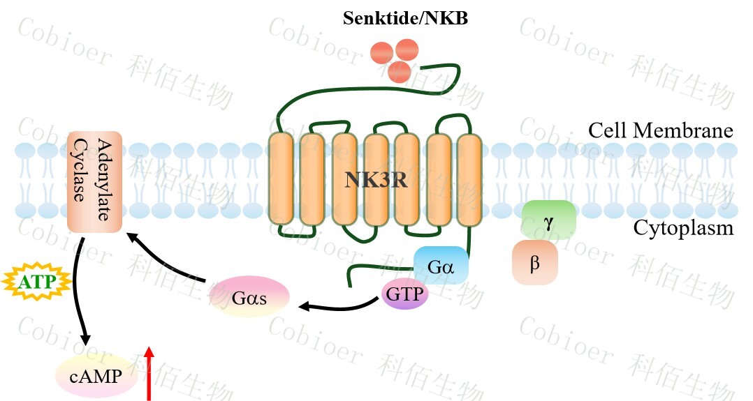 cAMP 在 G 蛋白偶聯(lián)受體(GPCR)信號(hào)轉(zhuǎn)導(dǎo)中是一種關(guān)鍵的第二信使。當(dāng)配體結(jié)合 到 GPCR,構(gòu)象發(fā)生變化,激活受體接著激活 G 蛋白,Gs 的激活導(dǎo)致腺苷酸環(huán)化酶調(diào)控 cAMP 的升高。NK3R HEK293 細(xì)胞藥靶模型很好的模擬了體內(nèi) NK3R 的信號(hào)轉(zhuǎn)導(dǎo)過(guò)程,原 理見(jiàn)下圖所示。