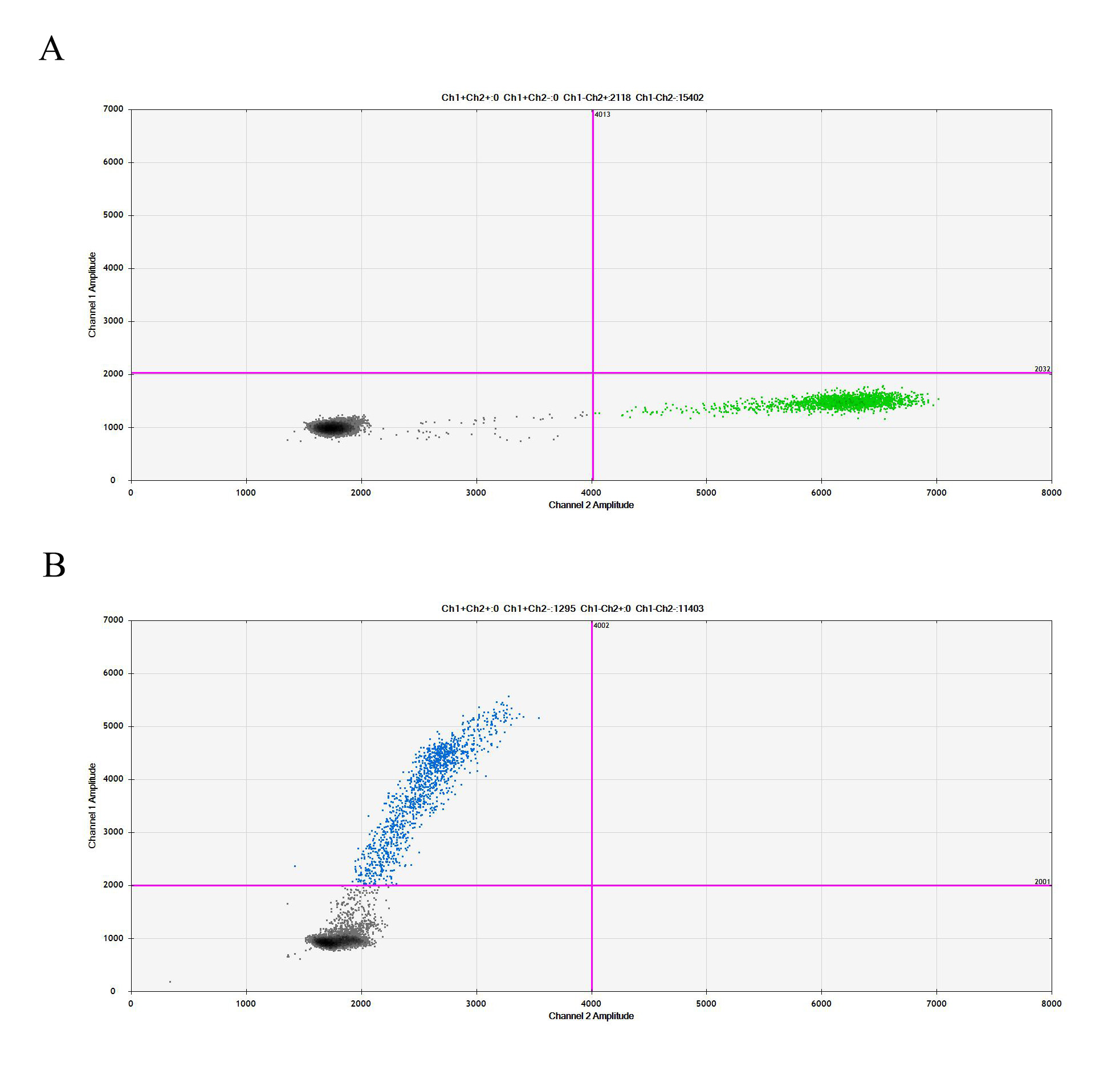 ![]() Figure 2. Sanger of ESR1[Y537N](Homozygous,AF%:100) Isogenic MCF7. ![]() Figure 3. A:MCF7 Parental Cell;B:ESR1[Y537N](Homozygous,AF%:100) Isogenic MCF7 通道2 藍色微滴代表ESR1[Y537N]突變陽性,通道2 綠色微滴代表該位點為陰性野生型 ![]() Figure 4. CTG Proliferation Assay of ESR1[Y537N(Homozygous,AF%:100) Isogenie MCF7(1C8). |