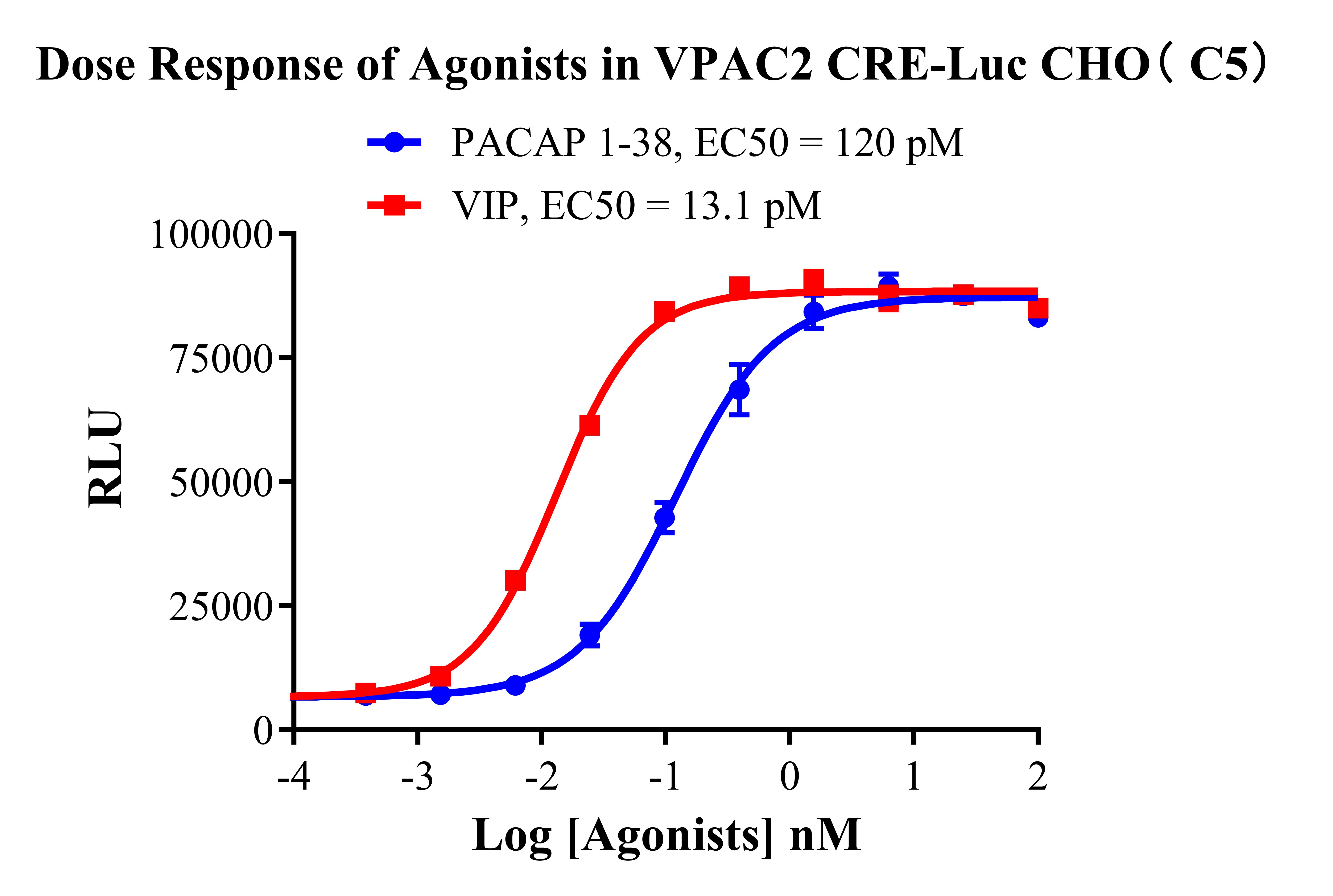 | PACAP/VIP 受體家族屬于 B 類 G 蛋白偶聯(lián)受體(GPCR),包含 PAC1R (PAC1)、 VPAC1R (VPAC1) 和 VPAC2R (VPAC2) 三個(gè)亞型,共同響應(yīng)神經(jīng)肽 PACAP(垂體腺苷酸 環(huán)化酶激活肽)和 VIP(血管活性腸肽)的調(diào)控,通過激活 Gs/cAMP-PKA 核心信號(hào)軸 (部分亞型偶聯(lián) Gq/PLC)廣泛協(xié)調(diào)神經(jīng)內(nèi)分泌、代謝穩(wěn)態(tài)與免疫調(diào)節(jié)。 VPAC2 受體(血管活性腸肽受體 2 型)作為 B 類 GPCR 的核心亞型,主要富集于下丘 腦視交叉上核(SCN)、胰腺β細(xì)胞、脂肪組織及骨細(xì)胞,以同等高親和力結(jié)合 VIP 和 PACAP,通過 Gs/cAMP-PKA 通路調(diào)控代謝穩(wěn)態(tài)與晝夜節(jié)律。VPAC2 的激活可同步 SCN 生物鐘基因(如 Per2)振蕩以維持睡眠-覺醒周期、促進(jìn)胰島素/胰高血糖素脈沖式分泌調(diào) 控血糖平衡、抑制破骨細(xì)胞分化并增強(qiáng)骨形成。 | |