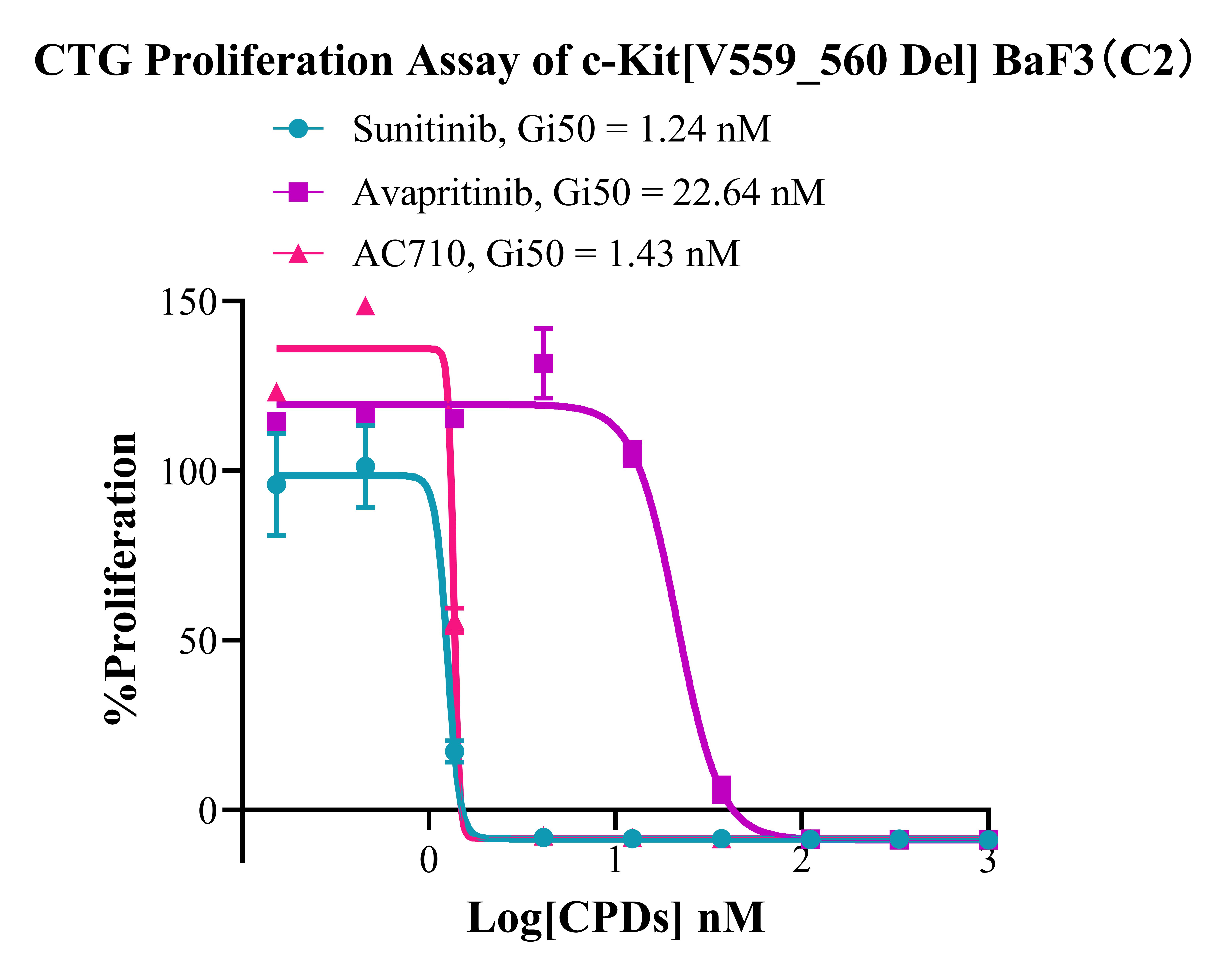 c-Kit[V559_560 Del] BaF3 藥 靶 細(xì) 胞 , 通過轉(zhuǎn)導(dǎo)缺失狀態(tài)的 c- Kit[V559_560 Del] 基因到 BaF3 細(xì)胞系中,穩(wěn)定表達(dá)人缺失形態(tài)下的 c-Kit[V559_560 Del] 基因。