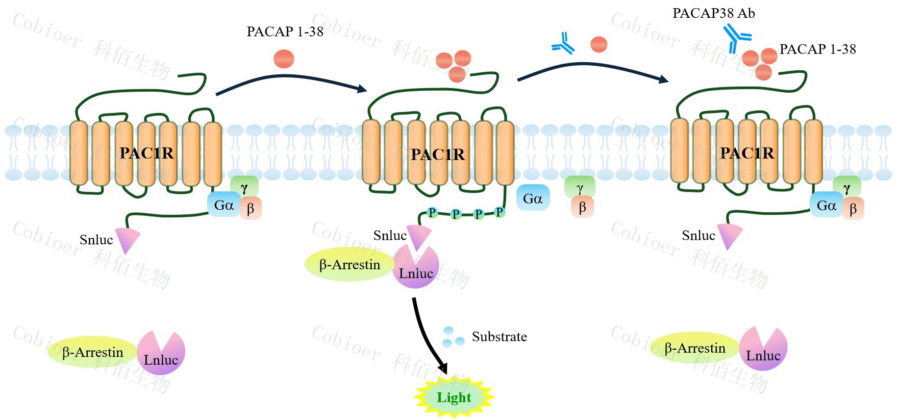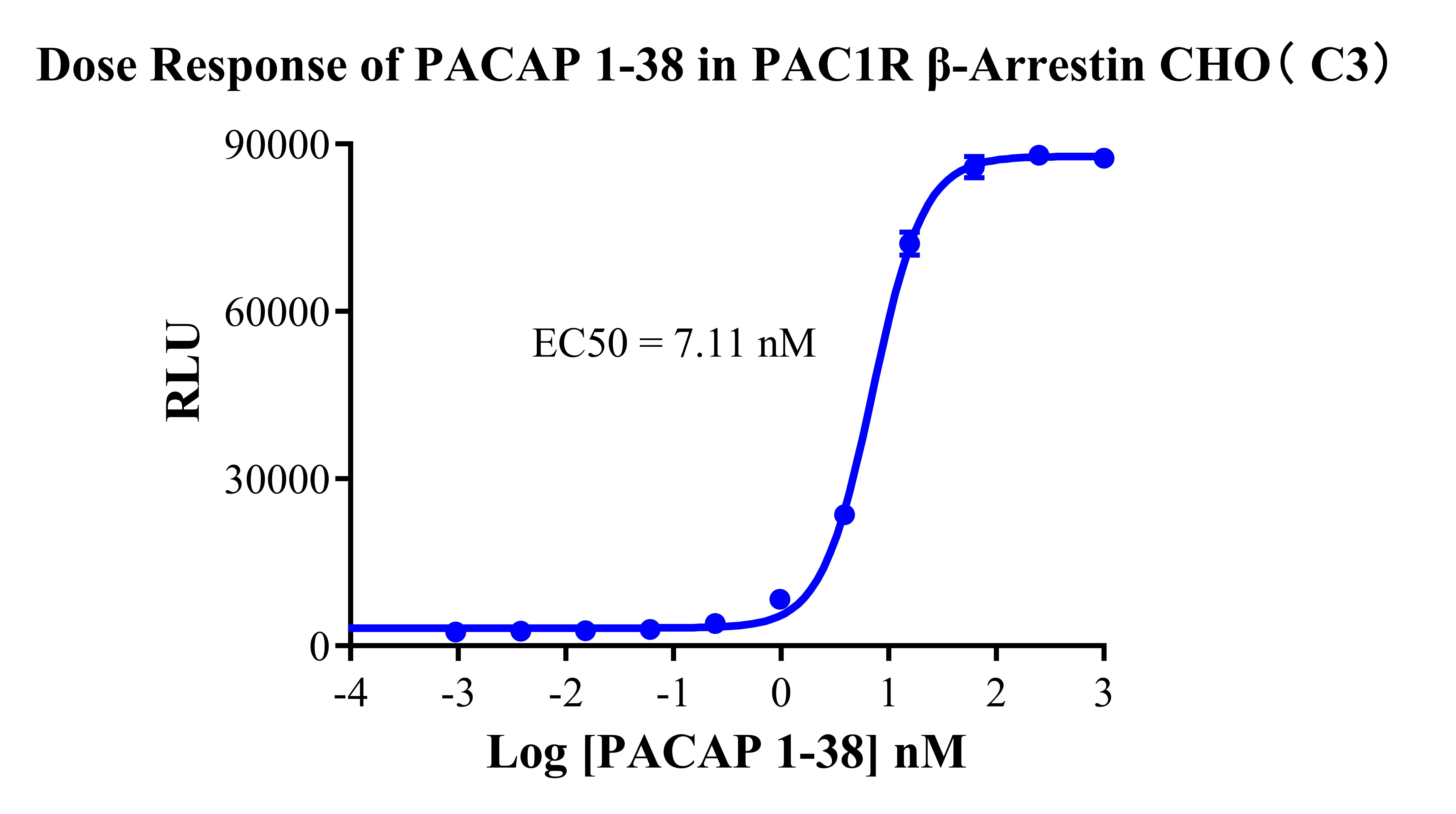 PAC1R β-Arrestin CHO 報(bào)告基因藥靶模型很好的模擬了體內(nèi) PAC1R/β-Arrestin 的信號(hào)轉(zhuǎn)導(dǎo)過程,原理見下圖所示。當(dāng)缺乏配體刺激時(shí),β-Arrestin 不與 PAC1R 結(jié)合,融合β- Arrestin 的熒光素酶處于失活構(gòu)象,當(dāng) PAC1R 遭遇配體刺激時(shí),融合熒光素酶報(bào)告基因的 β-Arrestin 被招募,使熒光素酶報(bào)告基因處于激活狀態(tài),加入其底物后發(fā)光信號(hào)增強(qiáng)。![]() Figure 1. PAC1R β-Arrestin CHO 細(xì)胞模型原理圖 |