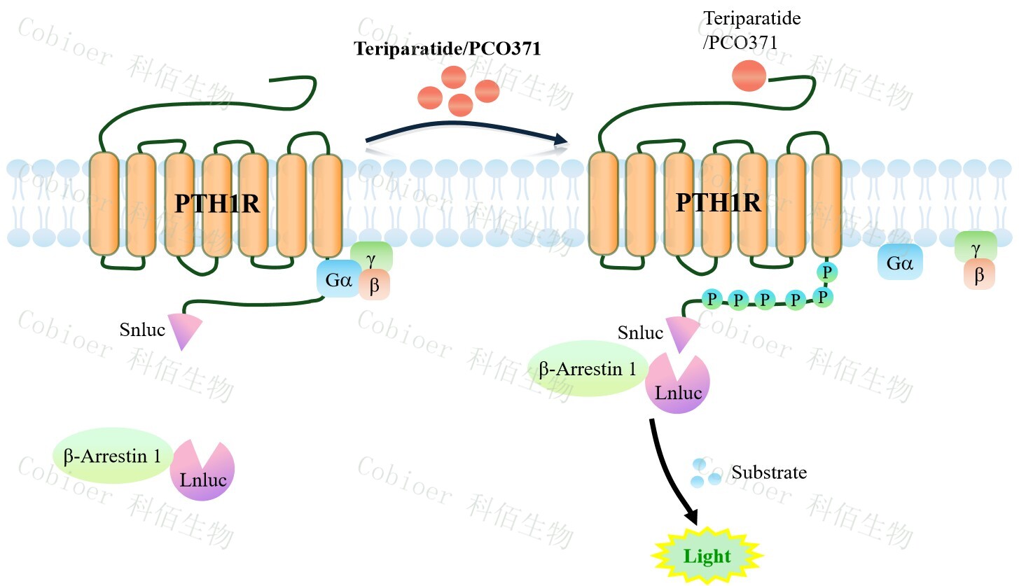 PTH1R β-Arrestin 1 CHO 報(bào)告基因藥靶模型很好的模擬了體內(nèi) PTH1R/β-Arrestin 1 的信號轉(zhuǎn)導(dǎo)過程,原理見下圖所示。當(dāng)缺乏配體刺激時(shí),β-Arrestin 1 不與 PTH1R 結(jié)合,融合β- Arrestin 1 的熒光素酶處于失活構(gòu)象,當(dāng) PTH1R 遭遇配體刺激時(shí),融合熒光素酶報(bào)告基因 的β-Arrestin 1 被招募,使熒光素酶報(bào)告基因處于激活狀態(tài),加入其底物后發(fā)光信號增強(qiáng)。![]() Figure 1. PTH1R β-Arrestin 1 CHO 細(xì)胞模型原理圖 |