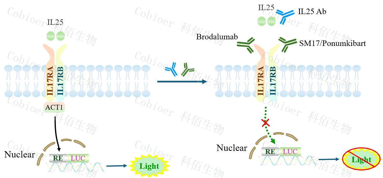 IL25 Effector Reporter Cell(Suspension)報告基因藥靶模型很好的模擬了體內(nèi) IL25 的信號轉(zhuǎn)導(dǎo)過程,原理見下圖所示。![]() Figure 1. IL25 Effector Reporter Cell(Suspension)細胞模型原理圖 |