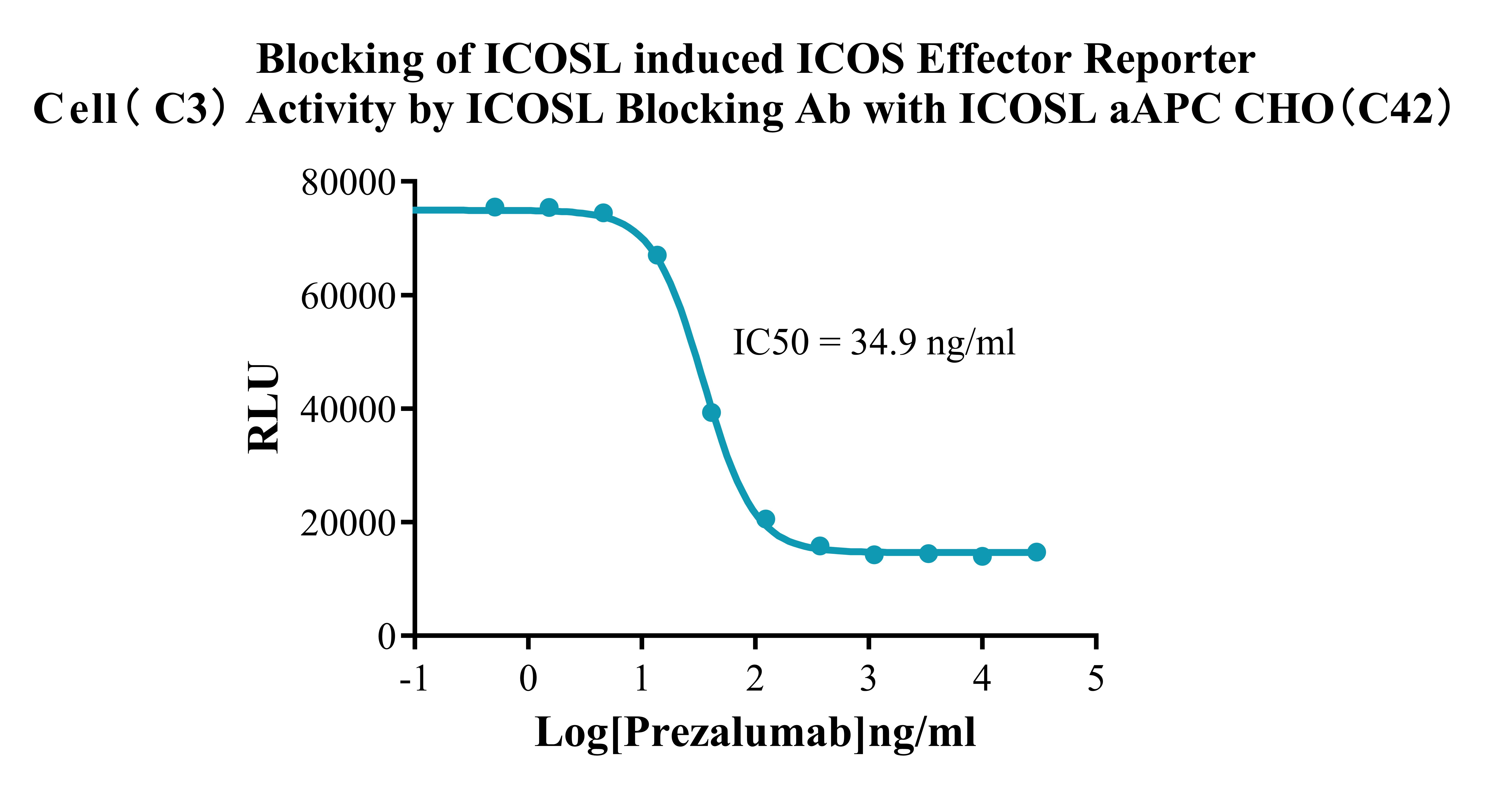 ![]() Figure 2. Recombinant ICOSL aAPC CHO stably expressing ICOSL. ![]() Figure 3. Blocking of ICOSL induced ICOS Effector Reporter Cell(C3) Activity by ICOSL Blocking Ab with ICOSL aAPC CHO(C42). |