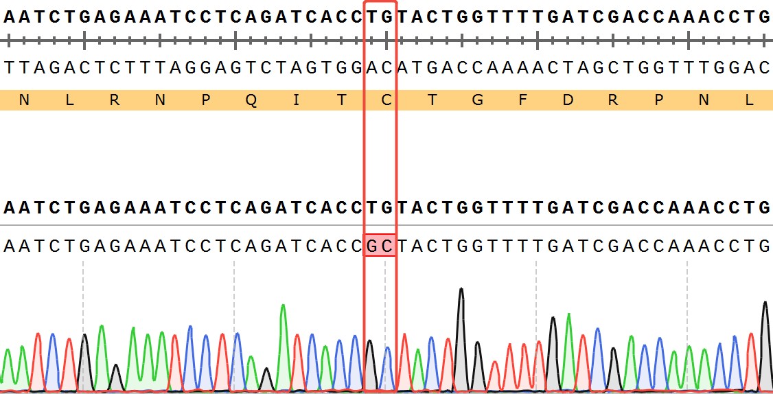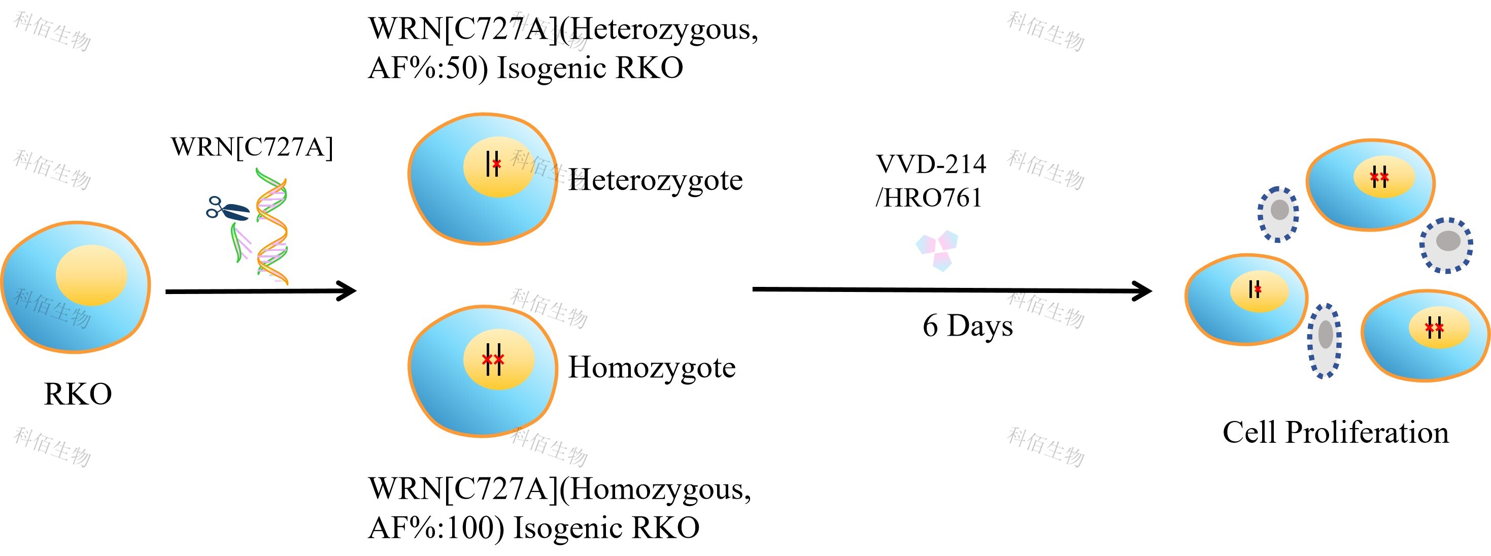 WRN[C727A](Homozygous,AF%:100) Isogenic RKO 藥靶細胞,通過基因 編輯的方式將 WRN 的 727 位氨基酸胱氨酸(C)突變?yōu)楸彼幔ˋ)。![]() Figure 1. WRN[C727A](Homozygous,AF%:100) Isogenic RKO 原理示意圖 |