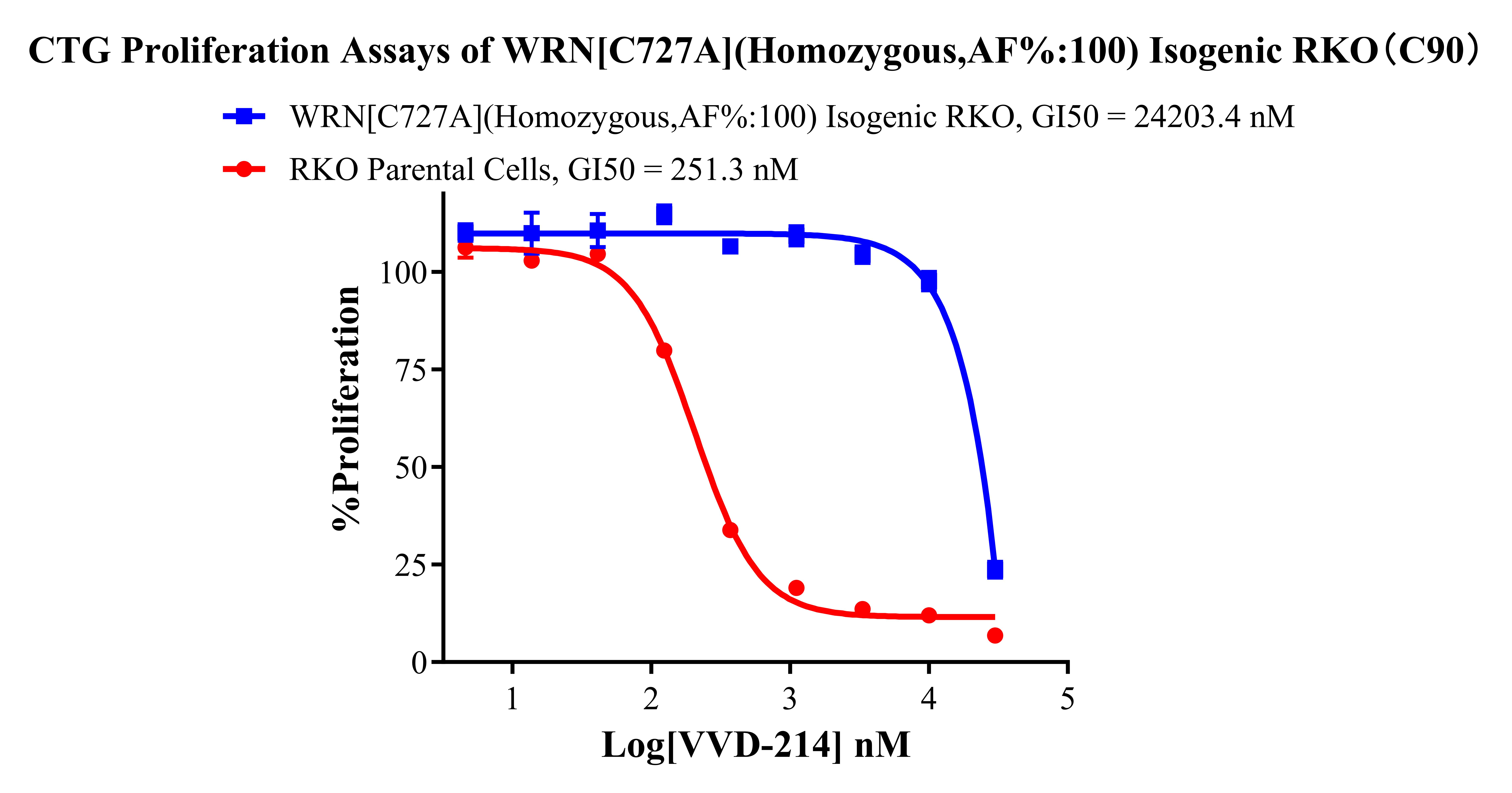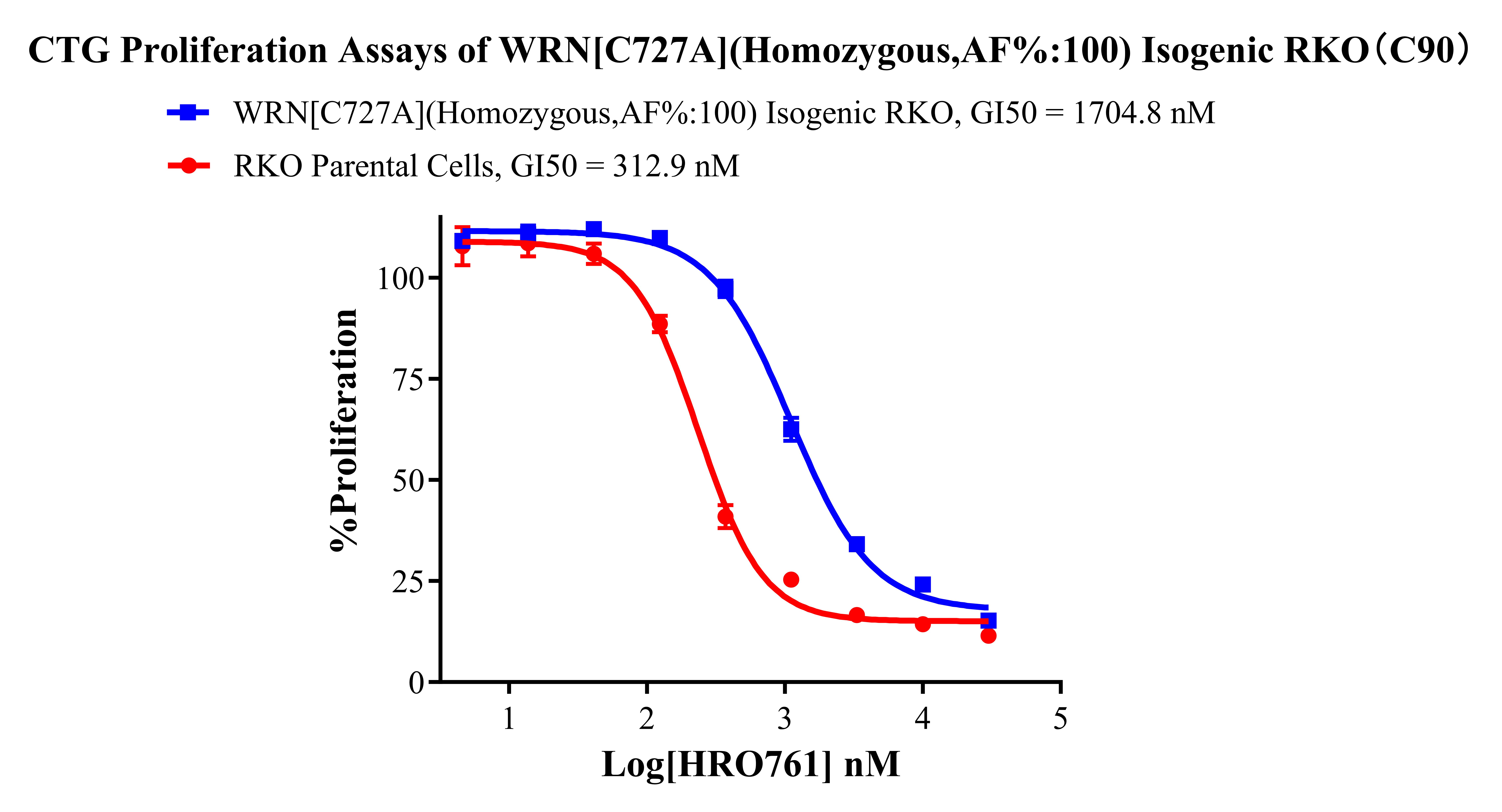 ![]() Figure 2. Sanger of WRN[C727A](Homozygous,AF%:100) Isogenic RKO. ![]() Figure 3. A:RKO Parental Cell;B:WRN[C727A](Homozygous,AF%:100) Isogenic RKO 通道2 藍色微滴代表WRN[C727A]突變陽性,通道2 綠色微滴代表該位點為陰性野生型 ![]() Figure 4. CTG Proliferation Assays of WRN [C727A](Homozygous,AF%:100) Isogenic RKO(C90). ![]() Figure 5. CTG Proliferation Assays of WRN [C727A](Homozygous,AF%:100) Isogenic RKO(C90). |