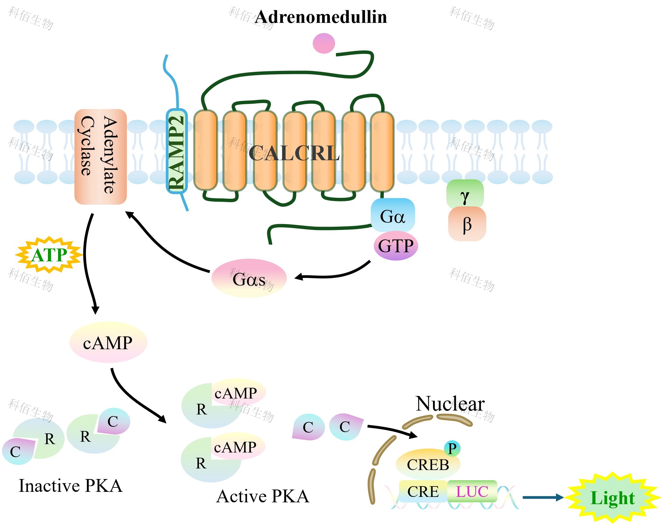 CALCRL&RAMP2 CRE-Luc HEK293 報告基因靶模型很好的模擬了體內(nèi) Adrenomedullin 的信號轉導過程,原理見下圖所示。