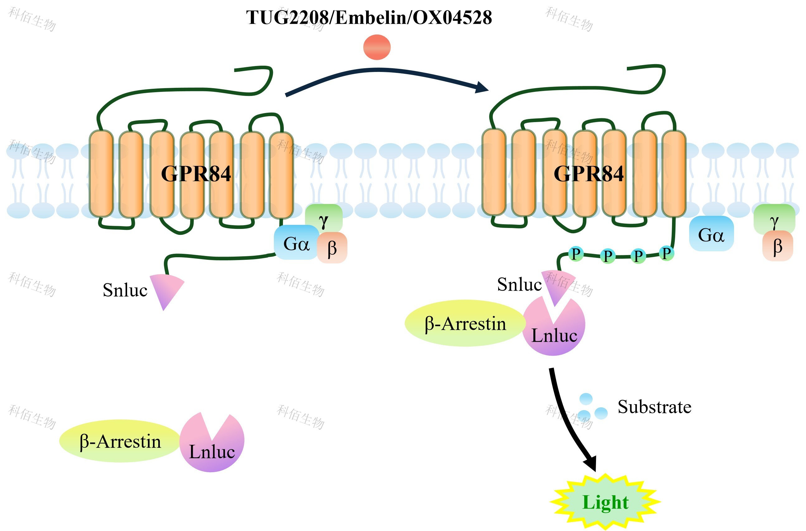 GPR84 β-Arrestin CHO 報告基因藥靶模型很好的模擬了體內(nèi) GPR84/β-Arrestin 的信號轉(zhuǎn)導過程,原理見下圖所示。當缺乏配體刺激時,β-Arrestin 不與 GPR84 結(jié)合,融合β- Arrestin 的熒光素酶處于失活構(gòu)象,當 GPR84 遭遇配體刺激時,融合熒光素酶報告基因的 β-Arrestin 被招募,使熒光素酶報告基因處于激活狀態(tài),加入其底物后發(fā)光信號增強。![]() Figure 1. GPR84 β-Arrestin CHO 細胞模型原理圖 |