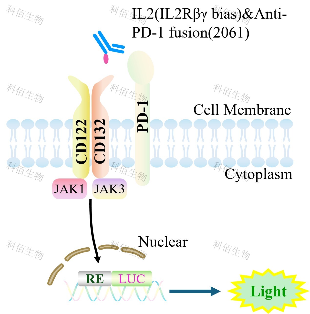 PD-1&IL2/IL15(hCD122/hCD132) Effector Reporter Cell 報告基因藥靶模型很好的模擬 了體內(nèi) PD-1&IL2 受體二亞基的信號轉導過程,原理見下圖所示。![]() Figure 1. PD-1&IL2/IL15(hCD122/hCD132) Effector Reporter Cell 細胞模型原理圖 |