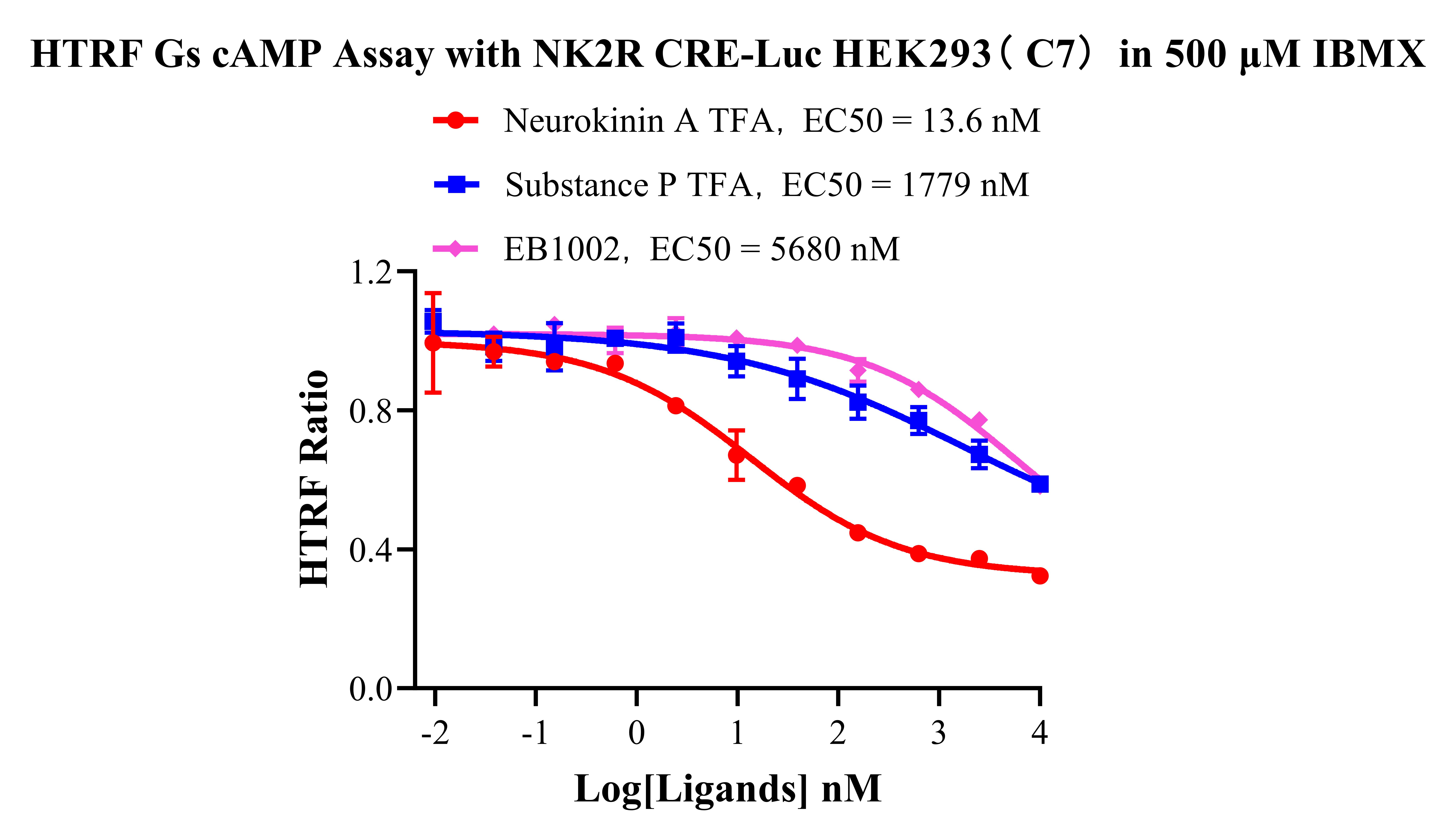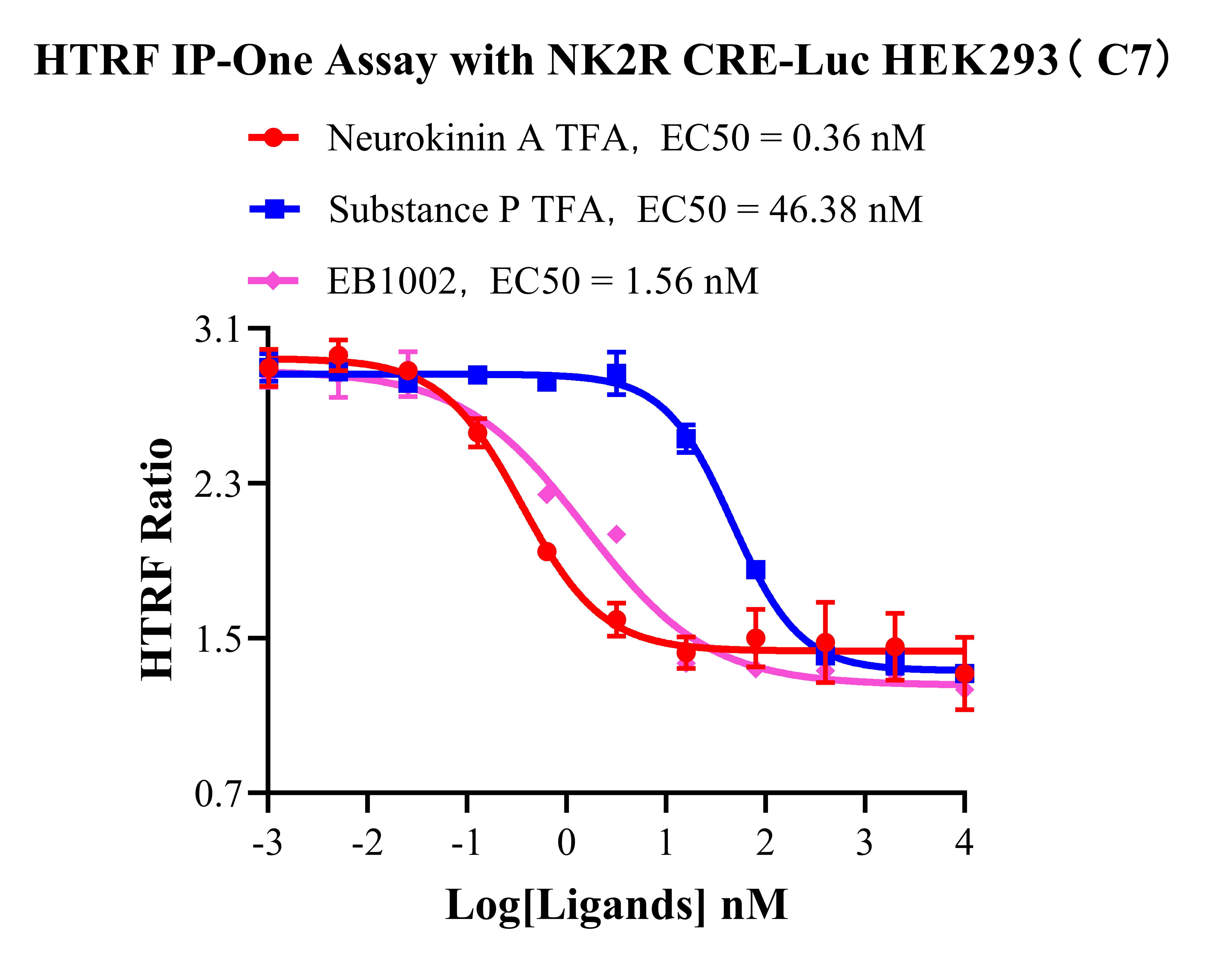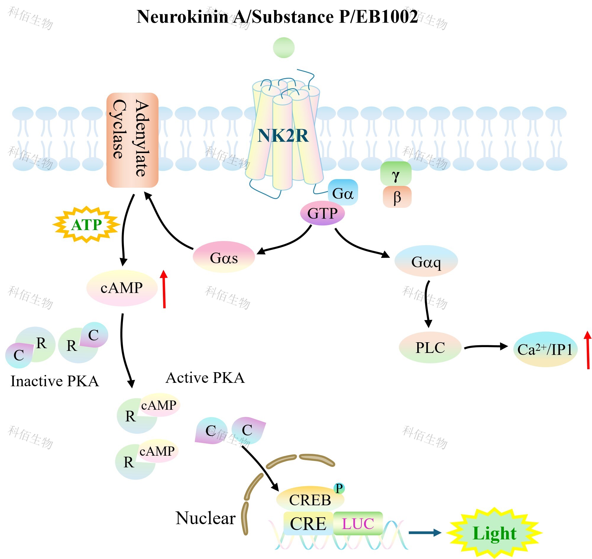 NK2R CRE-Luc HEK293 報告基因藥靶模型很好的模擬了體內(nèi) NK2R 的信號轉(zhuǎn)導(dǎo)過程, 原理見下圖所示。![]() Figure 1. NK2R CRE-Luc HEK293 細(xì)胞模型原理圖 |