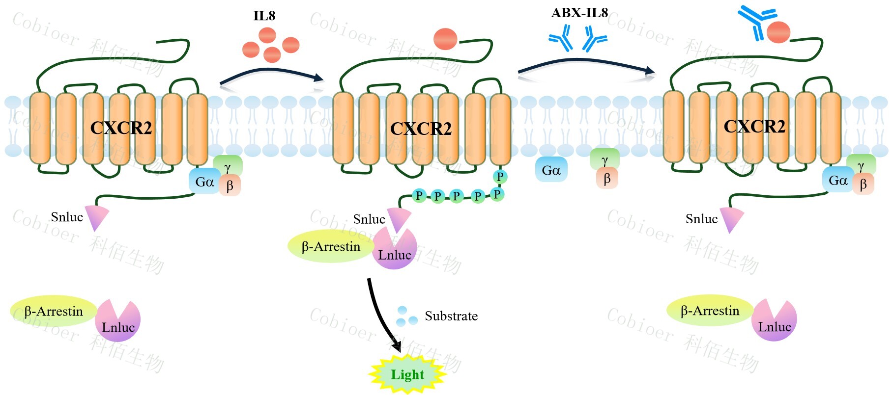 CXCR2 β-Arrestin CHO 報告基因藥靶模型很好的模擬了體內 CXCR2/β-Arrestin 的信號轉導過程,原理見下圖當缺乏配體刺激時,β-Arrestin 不與 CXCR2 結合,融合β- Arrestin 的熒光素酶處于失活構象,當 CXCR2 遭遇配體刺激時,融合熒光素酶報告基因的 β-Arrestin 被招募,使熒光素酶報告基因處于激活狀態(tài),加入其底物后發(fā)光信號增強。![]() Figure 1. CXCR2 β-Arrestin CHO 細胞模型原理圖 |