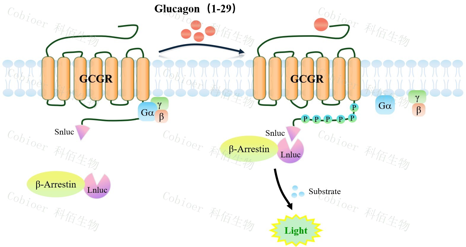 GCGR β-Arrestin CHO 報(bào)告基因藥靶模型很好的模擬了體內(nèi) GCGR/β-Arrestin 的信號(hào)轉(zhuǎn) 導(dǎo)過(guò)程,原理見(jiàn)下圖所示。當(dāng)缺乏配體刺激時(shí),β-Arrestin 不與 GCGR 結(jié)合,融合β- Arrestin 的熒光素酶處于失活構(gòu)象;當(dāng) GCGR 遭遇配體刺激時(shí),融合熒光素酶報(bào)告基因的β- Arrestin 被招募,使熒光素酶報(bào)告基因處于激活狀態(tài),加入其底物后發(fā)光信號(hào)增強(qiáng)。![]() Figure 1. GCGR β-Arrestin CHO 細(xì)胞模型原理圖 |