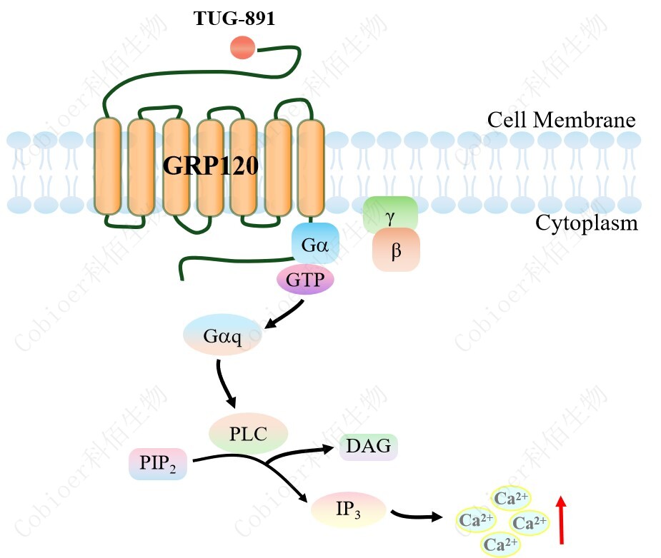 GPR120 與配體結(jié)合,導(dǎo)致 Gαq 亞基的激活,觸發(fā) PLC-γ,從而產(chǎn)生兩個第二信使: IP3 和 DAG,它們參與細(xì)胞內(nèi)鈣動員。GPR120 CHO 細(xì)胞藥靶模型很好的模擬了體內(nèi) GPR120 的信號轉(zhuǎn)導(dǎo)過程,原理見下圖所示。![]() Figure 1. GPR120 CHO 細(xì)胞模型原理圖 |