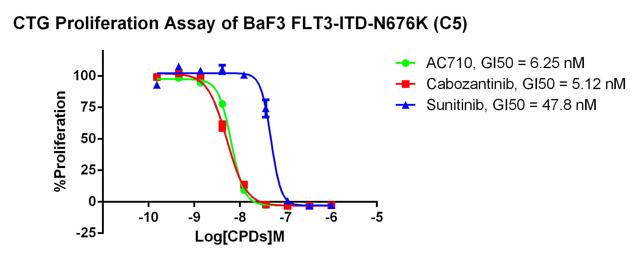 Figure 2. Anti-proliferation assay of two reference compounds on the FLT3-ITD [N676K]/BaF3 Stable Cell Line. |