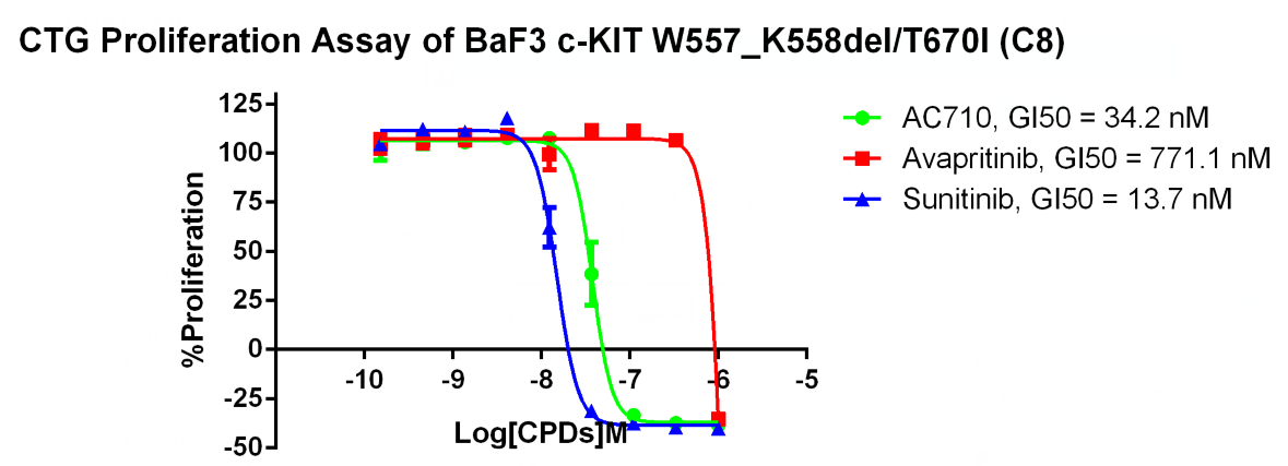 Figure 4. CTG Proliferation Assay of BaF3 C-KIT W557_ K558del/T670I (C8). |