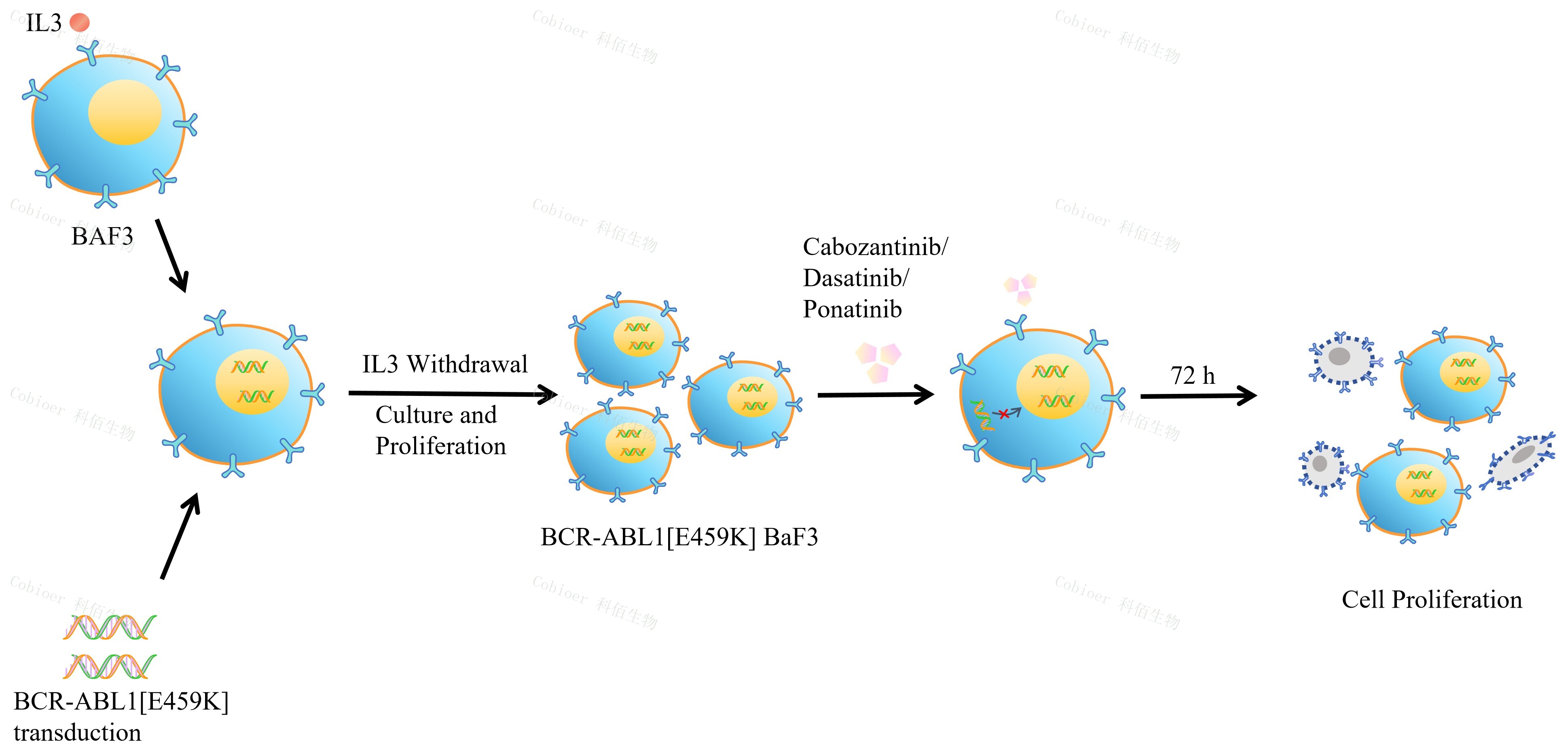 BCR-ABL1[E459K] BaF3 藥靶細(xì)胞 , 通過轉(zhuǎn)導(dǎo)突變 態(tài)的 BCR- ABL1[E459K]基因到 BaF3 細(xì)胞系中,穩(wěn)定表達(dá)人突變形態(tài)下的 BCR-ABL1[E459K]基因。