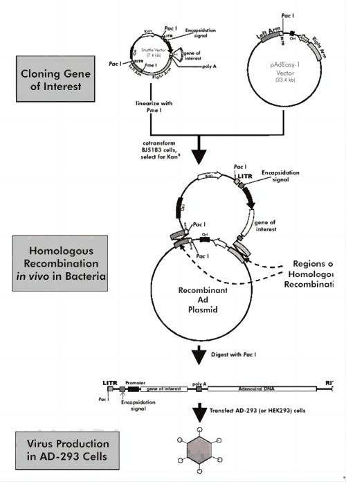 AdEasy包裝系統(tǒng)主要的特點(diǎn)是利用Cre/loxP系統(tǒng)在大腸桿菌(BJ5183)中完成外源基因插入腺病毒基因組的過(guò)程,獲得環(huán)狀的重組腺病毒基因組,并且具有在細(xì)菌中復(fù)制的必需元件。將重組腺病毒基因組酶切線(xiàn)性化后轉(zhuǎn)染HEK293細(xì)胞,避免了雙質(zhì)粒共轉(zhuǎn)染得到重組腺病毒。
