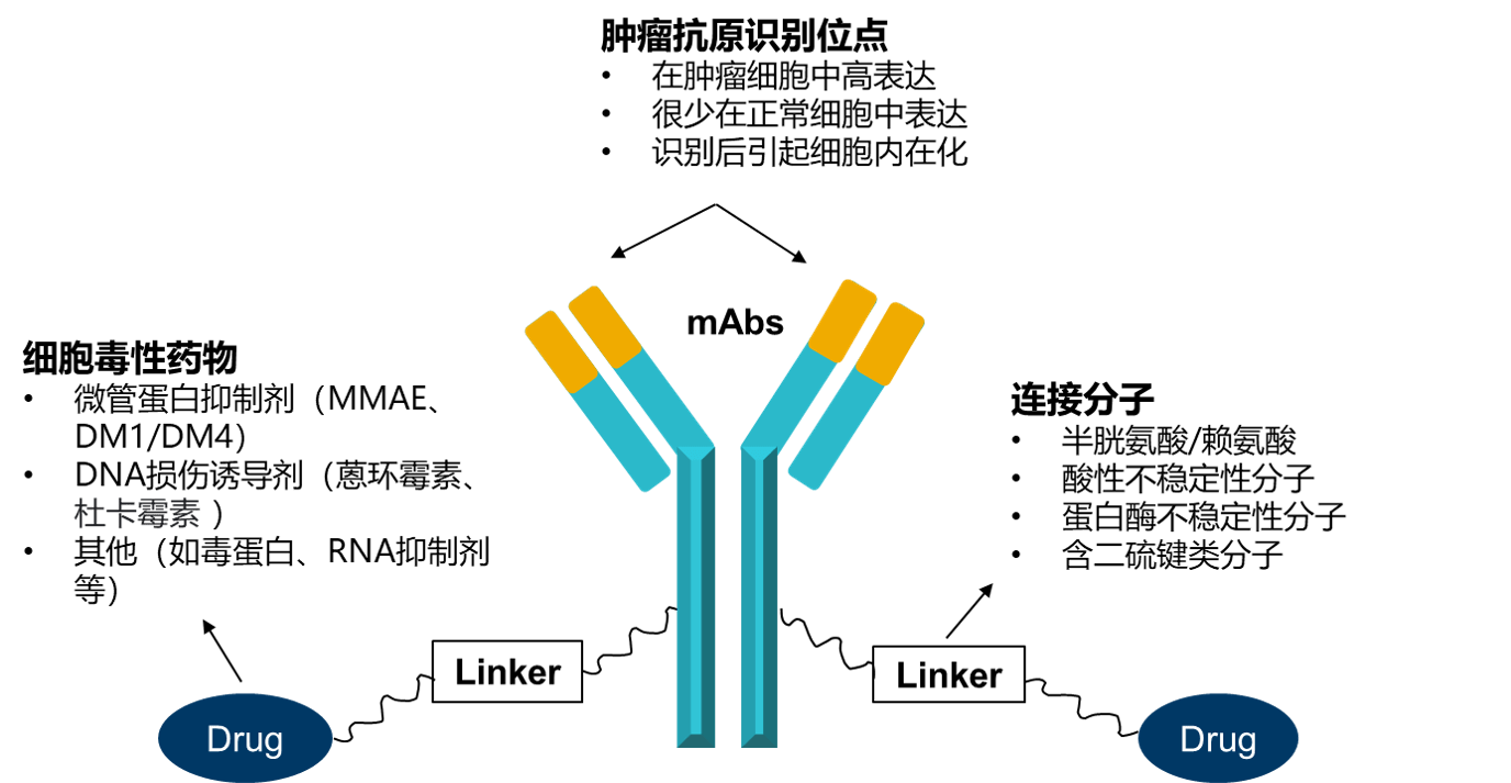 ADC(Antibody-drug conjugate,ADC)藥物全稱為抗體偶聯藥物,是將抗體通過偶聯臂(Linker)與小分子藥物(Payload)共價連接的復合物。抗體負責靶向病灶,毒素通過自身特性殺傷目標細胞,連接子則是承擔橋接毒素和抗體直至ADC到達腫瘤細胞內再進行釋放的功能。一個理想的ADC分子應該具備高靶點特異性、高腫瘤殺傷能力、長藥代特性、低免疫原性、低脫靶毒性。