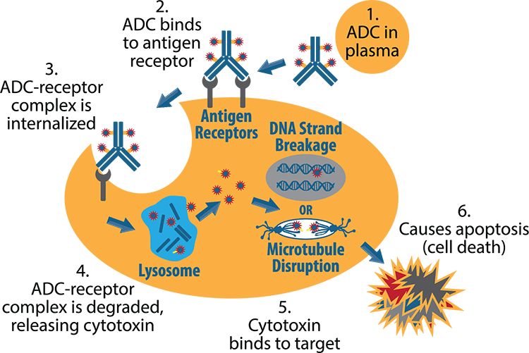 ADC藥物通過靜脈注射到血液中,隨著血液的流動,到達全身,但是科學家估計只有0.1%的ADC能到達患者的癌細胞。大部分會在循環(huán)系統和其他器官及組織中逐漸分解。到達癌細胞的ADC藥物一般是經歷6個過程來起作用。