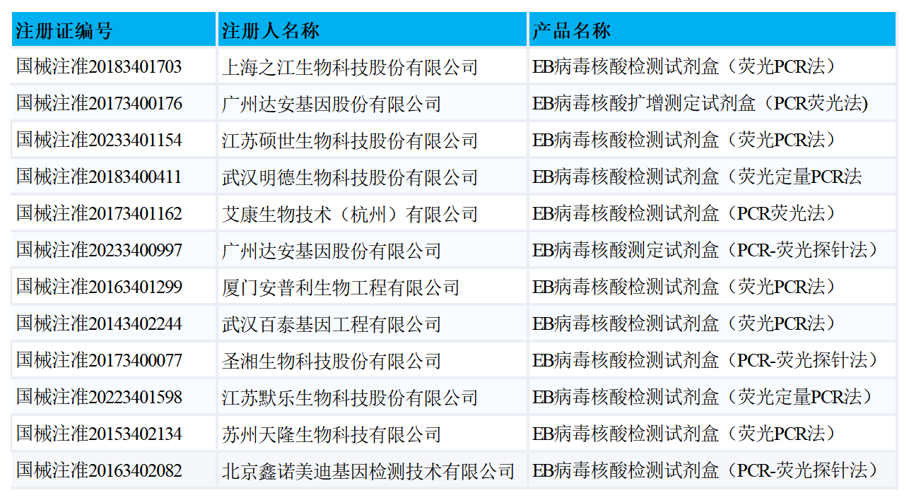 截至目前,已有12款EB病毒核酸檢測相關(guān)試劑盒獲批,具體如下: