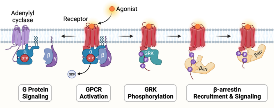 G蛋白偶聯(lián)受體(GPCR)是真核生物中最大,種類最多的膜受體。目前,F(xiàn)DA 批準(zhǔn)上市的臨床藥物中,約三分之一的藥物作用于 GPCRs發(fā)揮治療作用,GPCRs 被認(rèn)為是新藥研發(fā)領(lǐng)域中最重要,也是最有應(yīng)用前景的藥物靶點之一。GPCR 可被多種配體激活,與配體結(jié)合后,GPCR 的構(gòu)象會發(fā)生變化,從而導(dǎo)致特定效應(yīng)蛋白的募集和激活,并觸發(fā)下游信號通路的調(diào)節(jié)。GPCR的下游信號主要由G蛋白和β-arrestin介導(dǎo)。兩種信號之間的平衡可以受到偏向性配體的調(diào)控。偏向性配體選擇性激活某些信號,同時減少或阻止其它信號,為開發(fā)副作用小的藥物提供了方向。