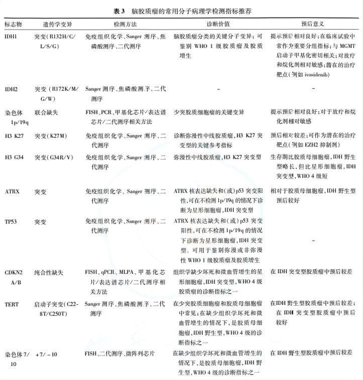 腦膠質(zhì)瘤確診需通過(guò)腫瘤切除術(shù)或活組織檢查術(shù)獲取標(biāo)本,進(jìn)行組織病理學(xué)和分子病理學(xué)整合診斷,以確定病理分級(jí)和分子亞型。分子標(biāo)志物對(duì)腦膠質(zhì)瘤的個(gè)體化治療及臨床預(yù)后判斷具有重要意義。