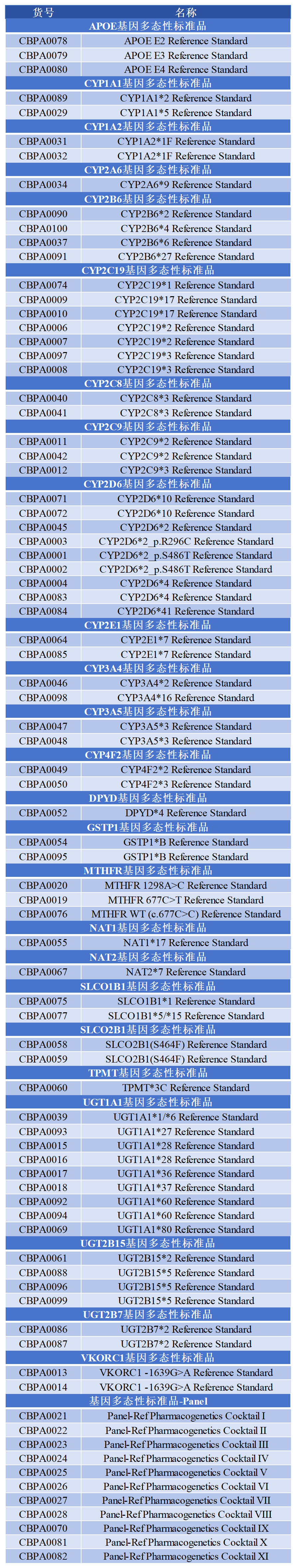 科佰生物目前可提供近百種用藥指導(dǎo)的質(zhì)控單品及混合質(zhì)控盤,涵蓋APOE、CYP1A1、CYP2A6、CYP2B6、CYP2C19、CYP2C8、CYP2C9、CYCP2D6、CYP2E1、CYP3A4、CYP3A5、CYP4F2、DPYD、GSTP1、MTHFR、NAT1、NAT2、SLCO1B1、TPMT、UGT1A1、UGT2B15、UGT2B7、VKORC1等多個藥物代謝基因,可在全流程對檢測過程進行監(jiān)控,幫助實現(xiàn)個體化用藥基因檢測的精準性。