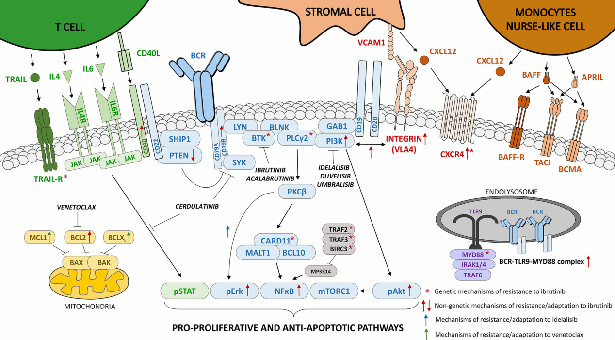 B細胞受體(BCR)信號通路在成熟B細胞惡性腫瘤的發(fā)生和進展中起著核心作用,例如慢性淋巴細胞白血?。–LL)、套細胞淋巴瘤(MCL)、彌漫性大B細胞淋巴瘤(DLBCL)、濾泡性淋巴瘤(FL)或華氏巨球蛋白血癥(WM)。BCR信號通路中的激活突變常見于DLBCL、FL或WM;而在CLL和MCL中一般會缺失,但BCR信號轉導被組成性激活,并且是其發(fā)病機制的關鍵參與者。