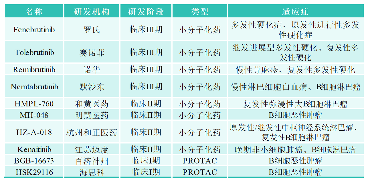 2013年,第一代BTK抑制劑Ibrutinib(伊布替尼)已被批準用于治療 CLL、MCL、WM 和邊緣區(qū)淋巴瘤 (MZL),它與BTK活性位點的半胱氨酸殘基形成共價鍵,封閉了ATP結合口袋,從而阻斷BTK的酶活性。雖然它是一種強效藥物,但它存在脫靶效應,并且相當多的患者對治療產(chǎn)生耐藥性或毒性而停止治療。第二代的BTK抑制劑(如Acalabrutinib等)在保持高選擇性的同時,減少了脫靶效應,提高了安全性和療效。但第一代和第二代的抑制劑都屬于不可逆抑制劑。BTK共價抑制劑治療后常會產(chǎn)生耐藥,部分耐藥機制為BTK 基因產(chǎn)生耐藥突變導致,其中最常見的耐藥突變?yōu)镃481位的氨基酸突變?yōu)镾。Pirtobrutinib是由禮來研發(fā)的首款獲批上市的非共價的第三代BTK抑制劑,它通過非共價、非C481依賴的結合阻斷BTK的ATP結合位點,從而克服由C481S導致的共價BTK抑制劑耐藥機制,另外包括fenebrutinib,Nemtabrutinib等也屬于同一類型的三代非共價抑制劑。除了上述共價或非共價BTK抑制劑外,為了進一步提高藥效和克服耐藥,近年來一些藥企也在開發(fā)針對BTK靶點的PROTAC藥物,下表為部分在研的BTK抑制劑以及PROTAC藥物。