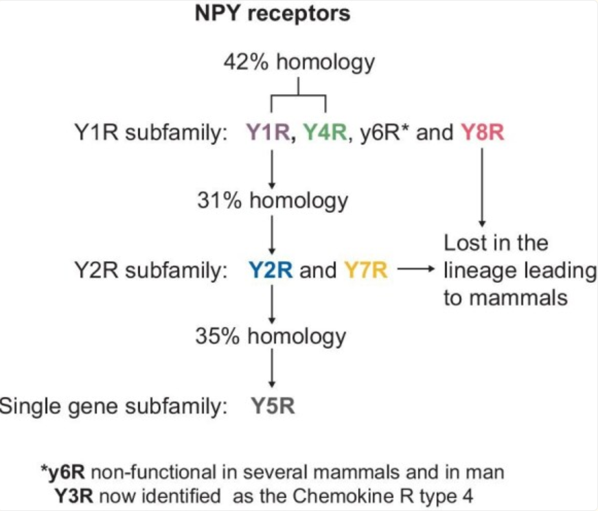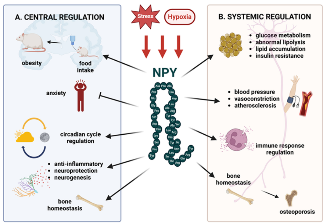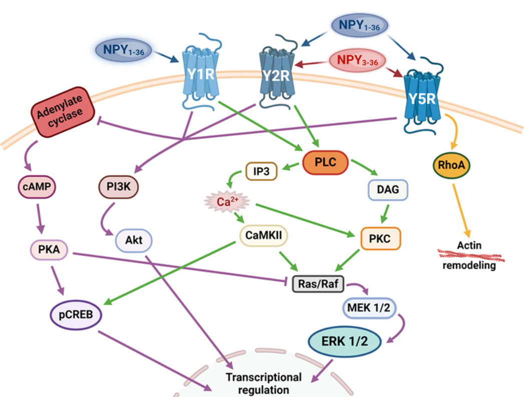 在人類中,NPY主要通過(guò)三種GPCR- Y1R、Y2R和Y5R起作用。Y1R需要全長(zhǎng)NPY1-36才能激活,而Y2R和Y5R也可以結(jié)合NPY3-36。所有NPY受體通過(guò)Gi/o蛋白發(fā)出信號(hào),并通過(guò)腺苷酸環(huán)化酶抑制cAMP合成,從而阻斷PKA對(duì)下游通路的抑制作用。NPY信號(hào)傳導(dǎo)的第二種機(jī)制是針對(duì)Y1R和Y2R的,涉及Ca 2 +的動(dòng)員以及隨后PKC和CaMKII的鈣依賴性激活。同時(shí),這些信號(hào)通路導(dǎo)致ERK1/2的激活。此外,所有NPY受體都能夠激活PI3K/Akt通路。Y5R的具體特征是能夠激活RhoA,從而調(diào)節(jié)細(xì)胞骨架重塑。