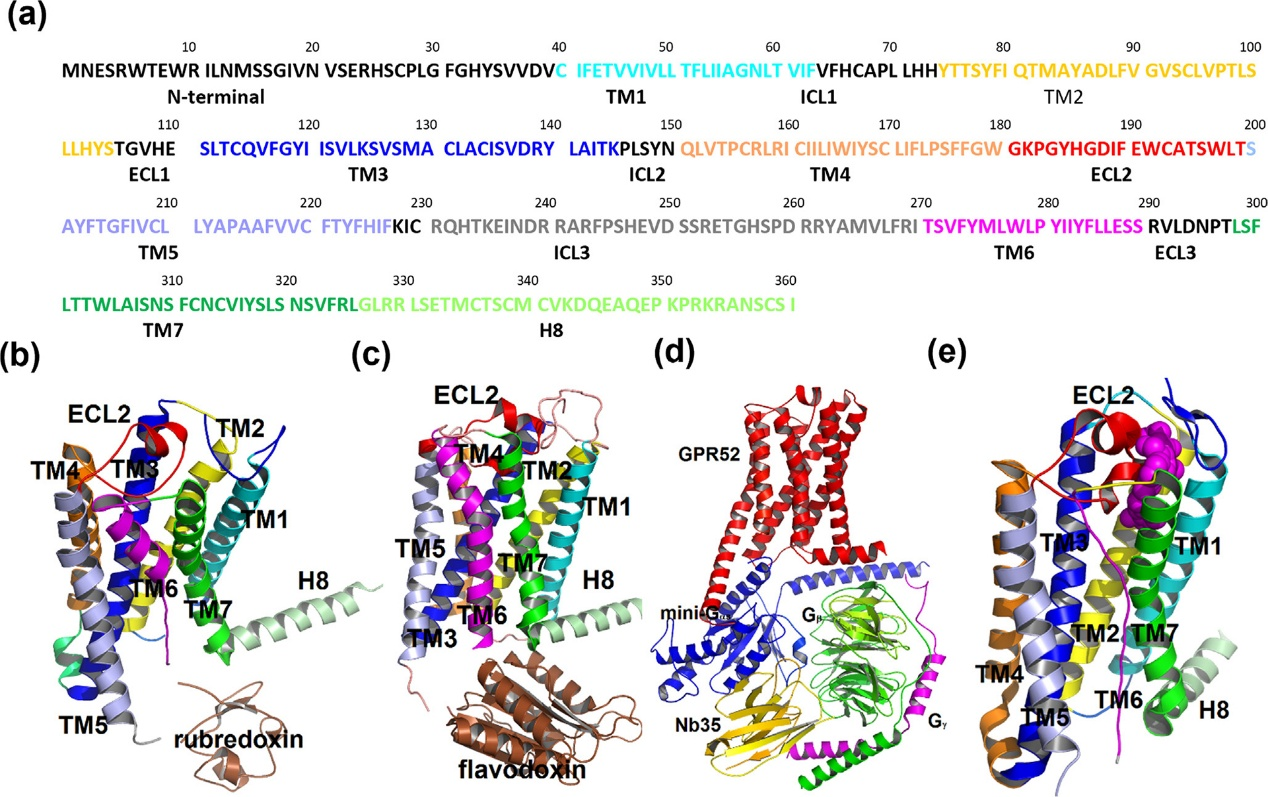 GPR52作為A類(lèi)孤兒GPCR的一員,具有獨(dú)特的結(jié)構(gòu)特征。它由361個(gè)氨基酸組成,包含一個(gè)細(xì)胞外N末端結(jié)構(gòu)域(氨基酸殘基1-39),七個(gè)經(jīng)典的跨膜結(jié)構(gòu)域(TM1-TM7),這些跨膜螺旋結(jié)構(gòu)域通過(guò)疏水相互作用穩(wěn)定地鑲嵌在細(xì)胞膜中,形成了受體的核心結(jié)構(gòu)框架,不僅維持了受體的整體穩(wěn)定性,還參與了信號(hào)的跨膜傳遞過(guò)程;