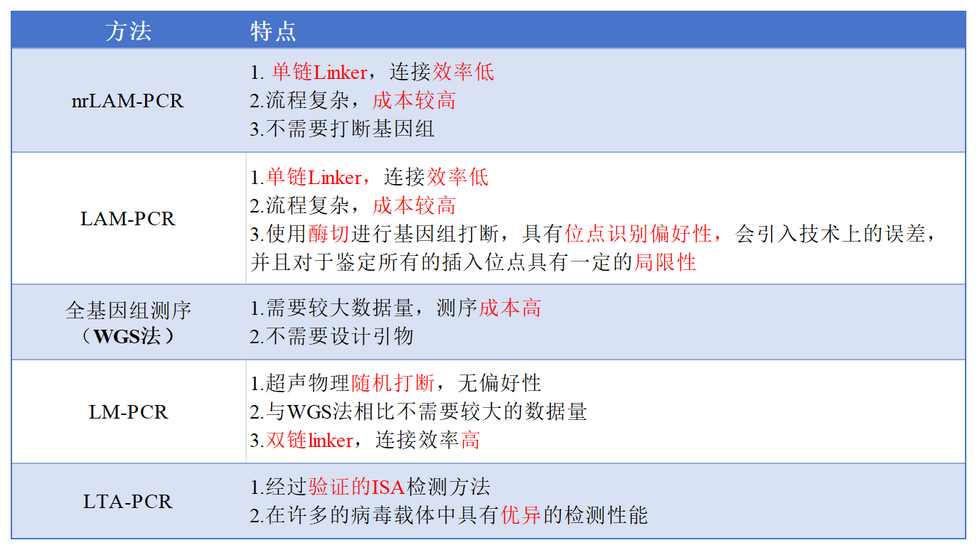Table 1. 主流的慢病毒整合位點檢測方法比較