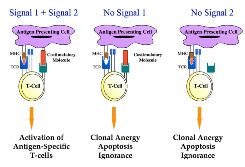 但僅有信號(hào)1無(wú)法有效激活T細(xì)胞的免疫反應(yīng),還需要足夠的共刺激信號(hào)(信號(hào)2)。信號(hào)2不是抗原特異性的,而是通過(guò)抗原呈遞細(xì)胞上表達(dá)的共刺激信號(hào)分子和T細(xì)胞的相互作用而實(shí)現(xiàn)的。共刺激信號(hào)對(duì)于T細(xì)胞的增殖,分化和存活是必要的。如果沒(méi)有共刺激信號(hào),可能會(huì)出現(xiàn)T細(xì)胞無(wú)應(yīng)答/應(yīng)答低下,細(xì)胞死亡或者會(huì)有免疫耐受的情況。