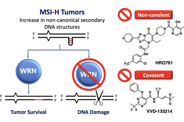 國(guó)際頂級(jí)期刊之一Nature于去年同一天上線了兩篇關(guān)于WRN(Werner綜合征RecQ解旋酶)抑制劑的文章,其中一篇是關(guān)于Novartis的HRO761的發(fā)現(xiàn)過程,另一篇介紹了拜耳(Bayer)旗下Vividion Therapeutics 公司的VVD-133214 (又叫RO7589831)的發(fā)現(xiàn)過程。這些文章重燃了醫(yī)藥行業(yè)對(duì)“WRN”這個(gè)合成致死靶點(diǎn)的關(guān)注。