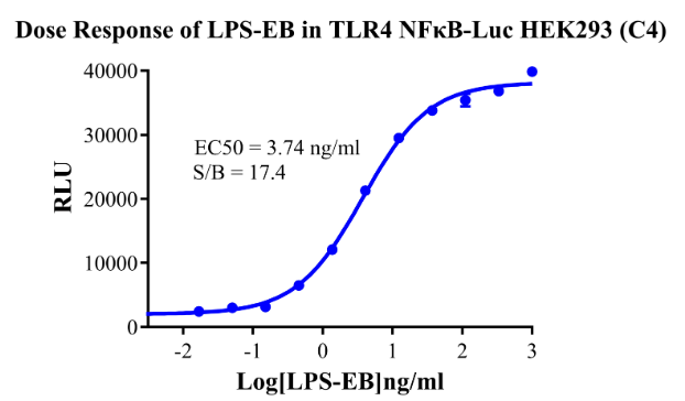 Figure 5.Detect Luciferase assay by Ultra Luciferase Detection Kit CBPH0001(we strongly suggest to purchase from Cobioer). Dose Response of LPS-EB in TLR4 NFκB-Luc HEK293(C4).