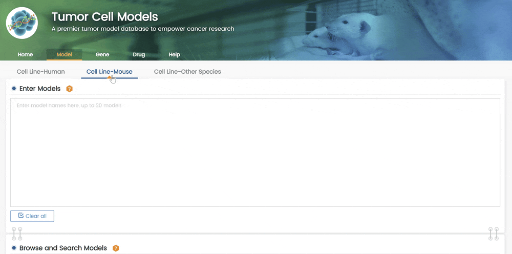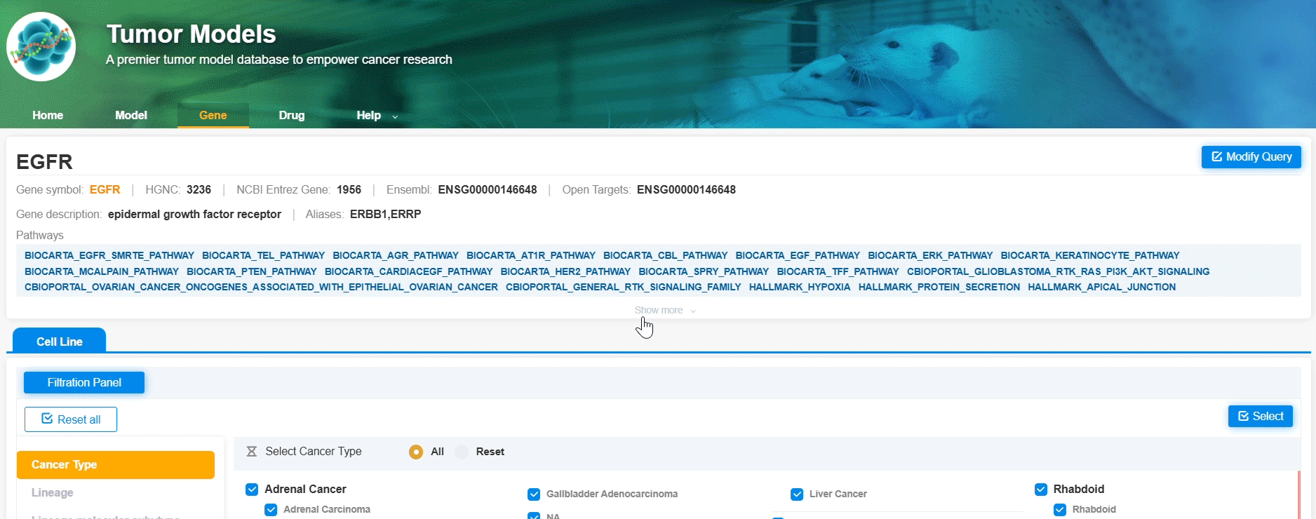 1.點擊模型頁面瀏覽所有模型,并應用多模型篩選功能,包括人類細胞系、小鼠細胞系及其他物種細胞系模型。下圖演示了如何查看人類細胞系模型:使用頁面篩選選項縮小選擇范圍,并執(zhí)行多模型檢索。