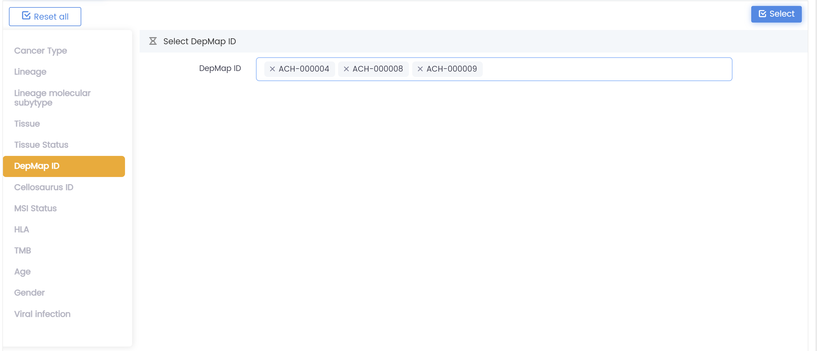 2.按癌癥類型、譜系、亞型、組織、性別、年齡、病毒感染及其他相關因素篩選樣本。默認選中所有癌癥類型。點擊“重置”重新選擇,隨后點擊右上角的“選擇”按鈕確認篩選條件。